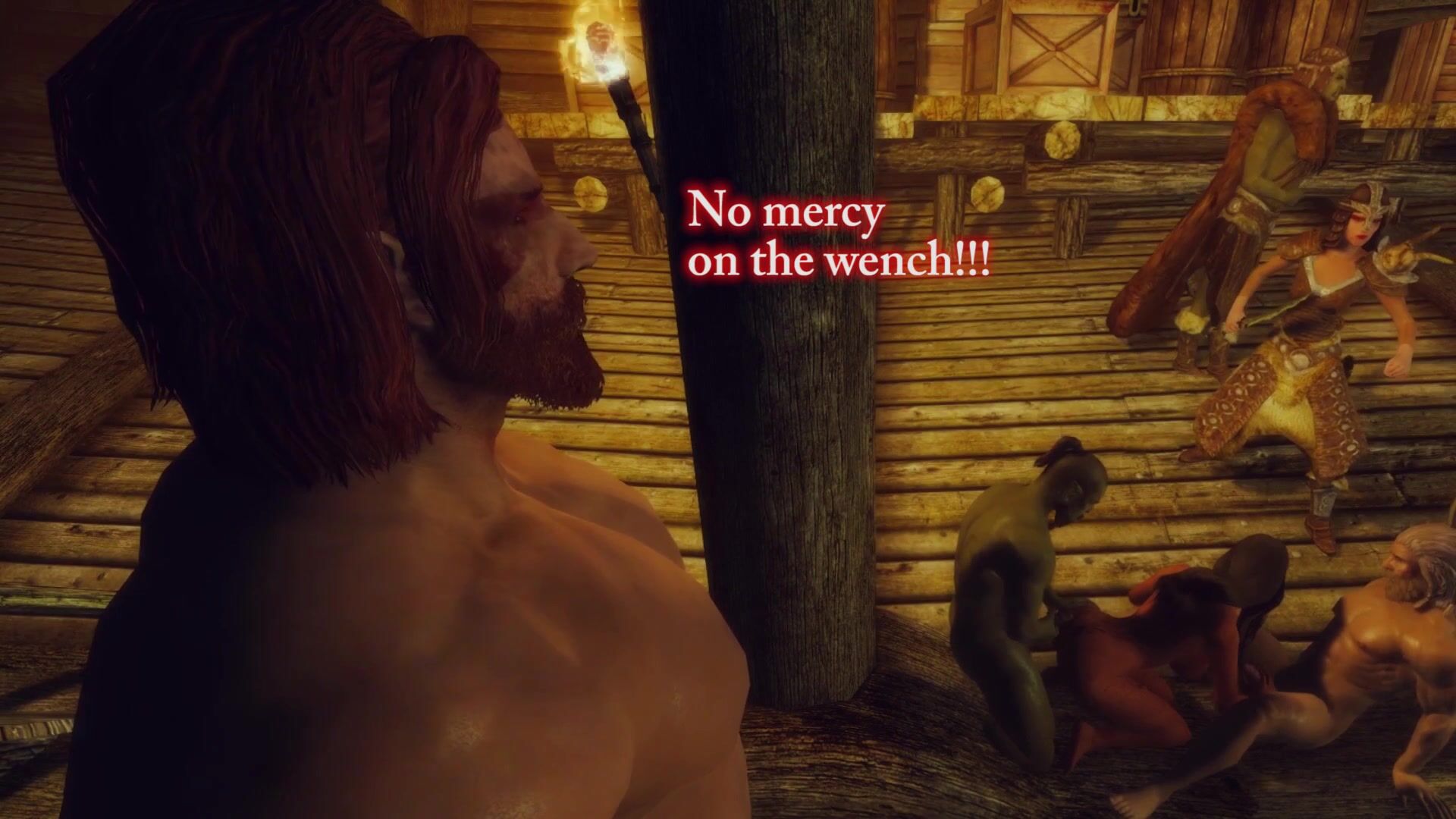 A group of Skyrim bandits engage in a gangbang with the bard, who uses her skills to turn the experience into a musical masterpiece