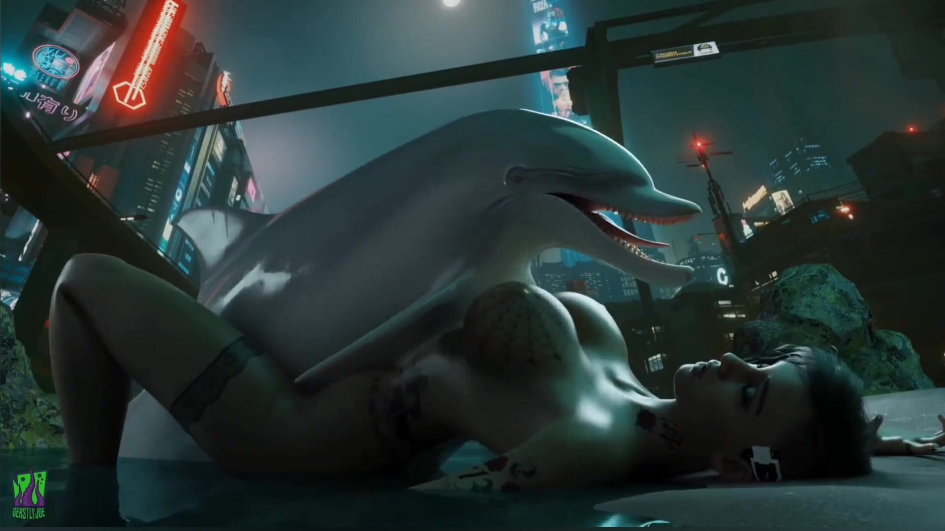 A sexy dolphin with a big dick penetrates Judy in the night city Watch as this beastly creature fucks her in every hole until she cums hard!