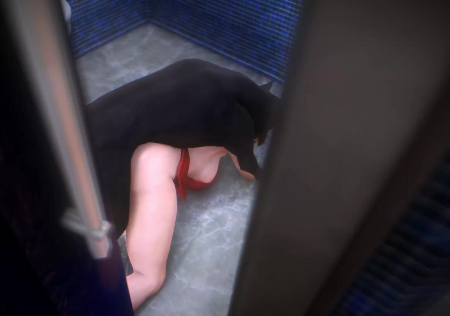 A young woman gets caught masturbating in public restroom and is caught by a group of men who decide to have some fun with her in the open space