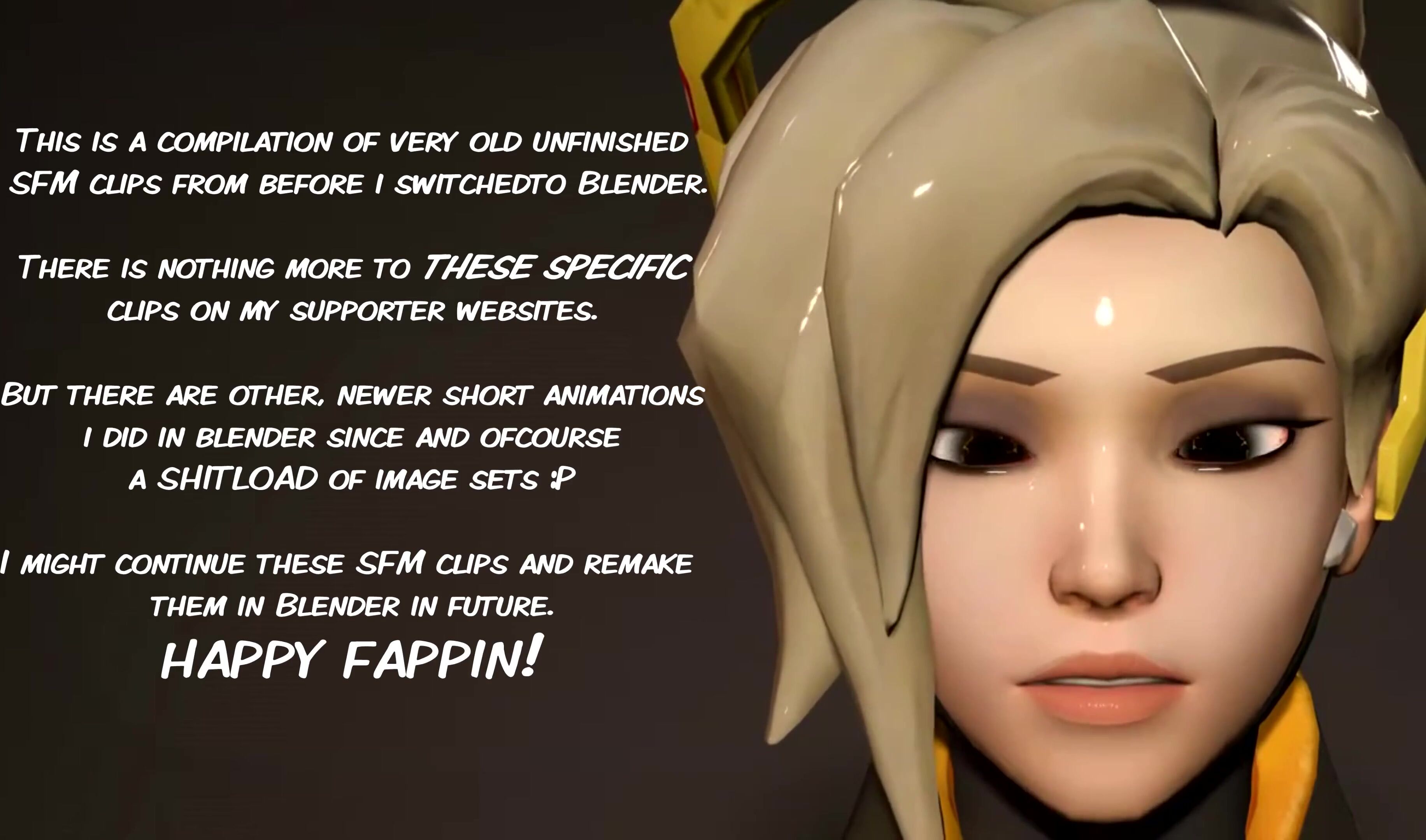 This is a compilation of very old unfinished SFM clips from before i switched to Blender. There is nothing more to THESE SPECIFIC clips on my supporter websites. But there are other, newer short animations i did in blender since and ofcourse a SHITLOAD of image sets :P I might continue these SFM clips and remake them in Blender in future. Links https://nisama3dx.fanbox.cc https://subscribestar.adult/nisama3dx https://twitter.com/Nisama3dx Follow and support me if you like my work. HAPPY FAPPIN!