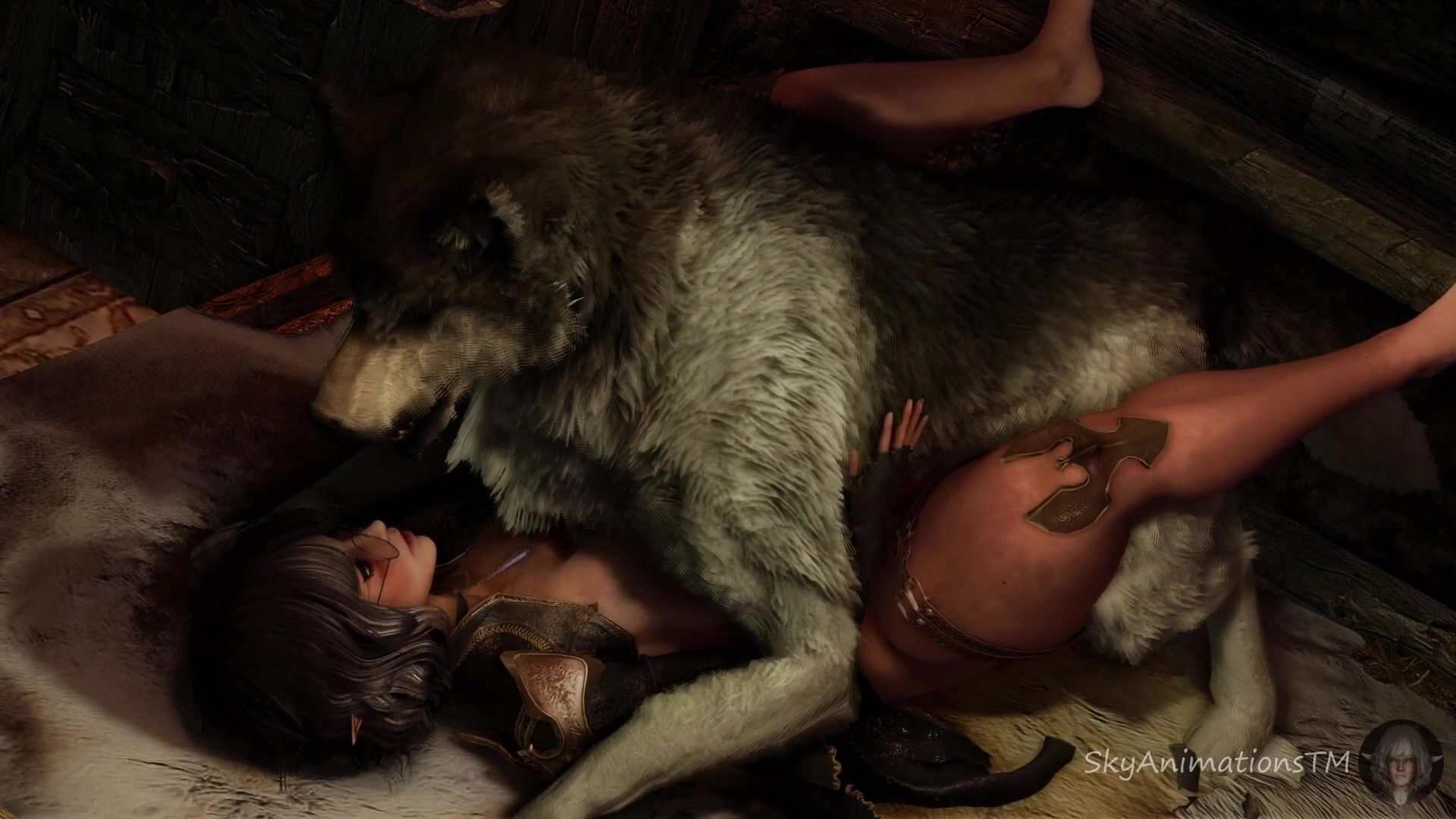 'Big-breasted Milf takes a huge cock in her bed while being fucked by two huskies.'