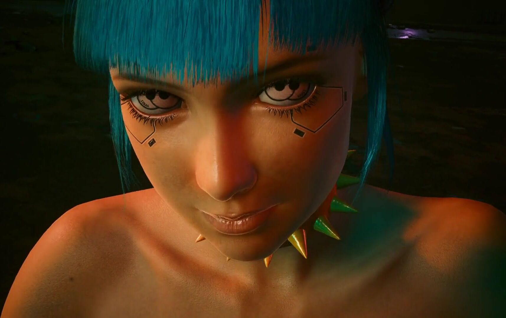 'Bluemooon as Rogue Amendiares and Vincent (as Johnny Silverhand) engage in a passionate love scene in the moonlight.'