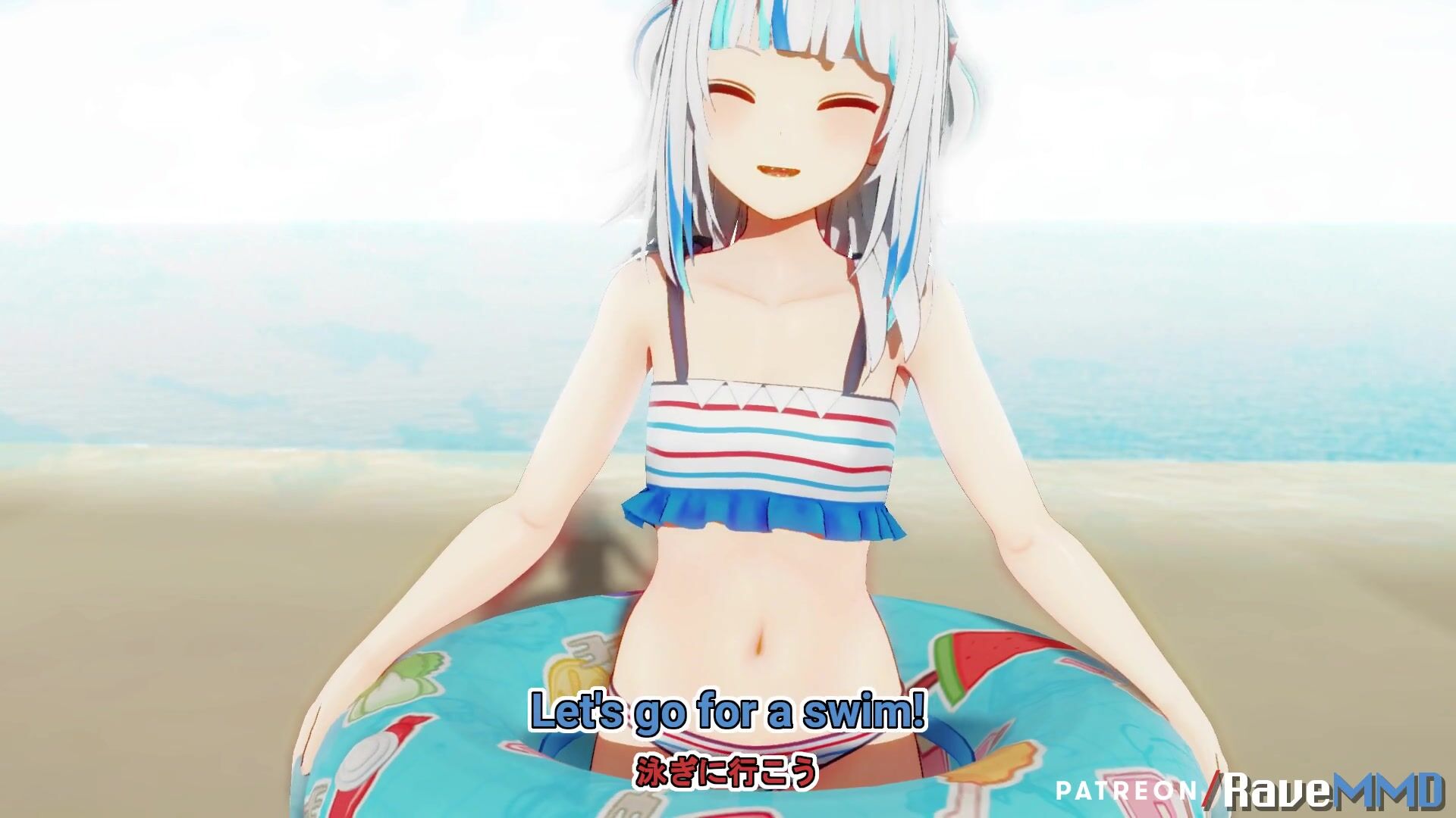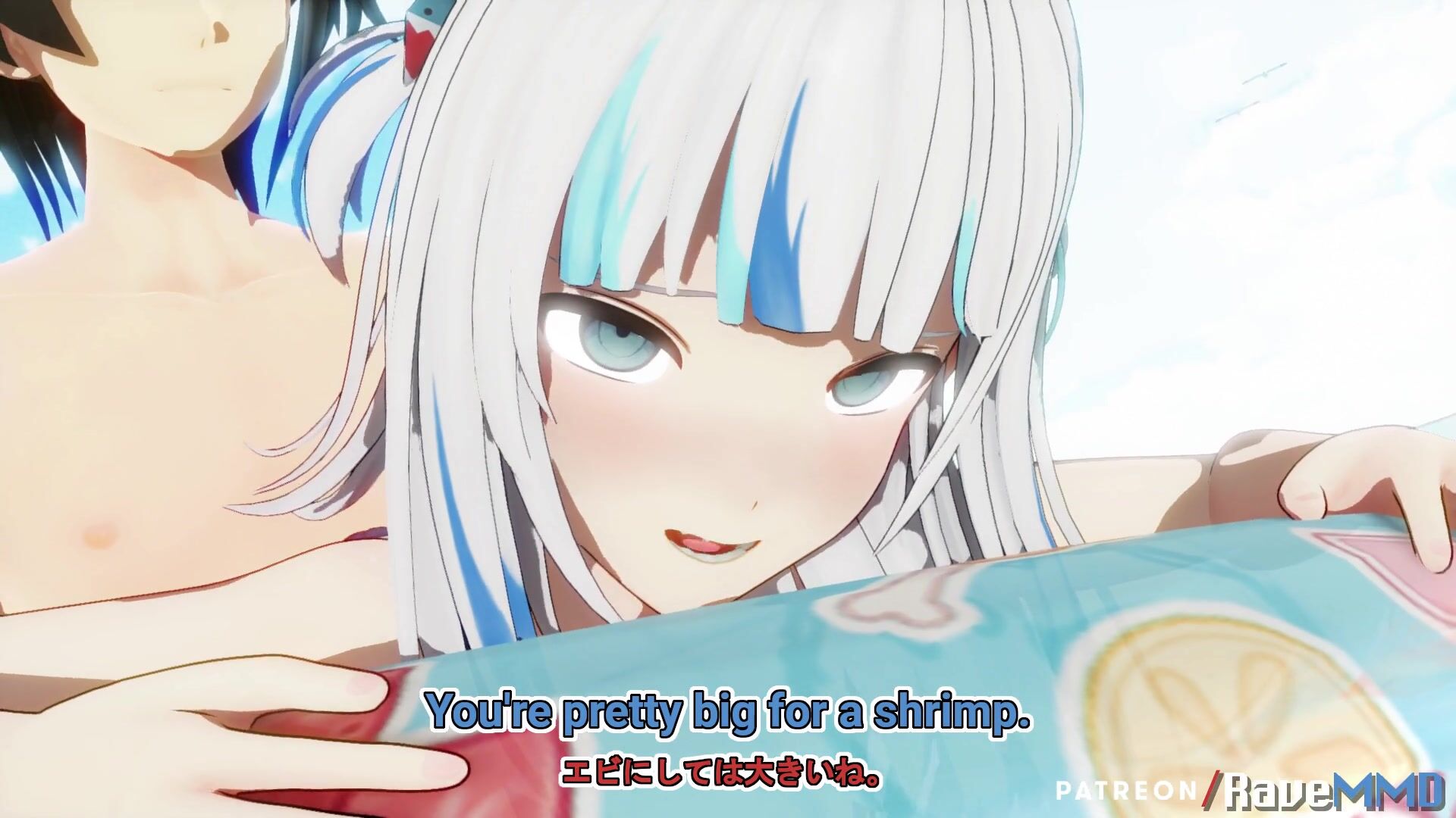This is a hentai porn video description about Gura teasing someone at the beach. The user wants to know if they're going to let it happen or do something about it.