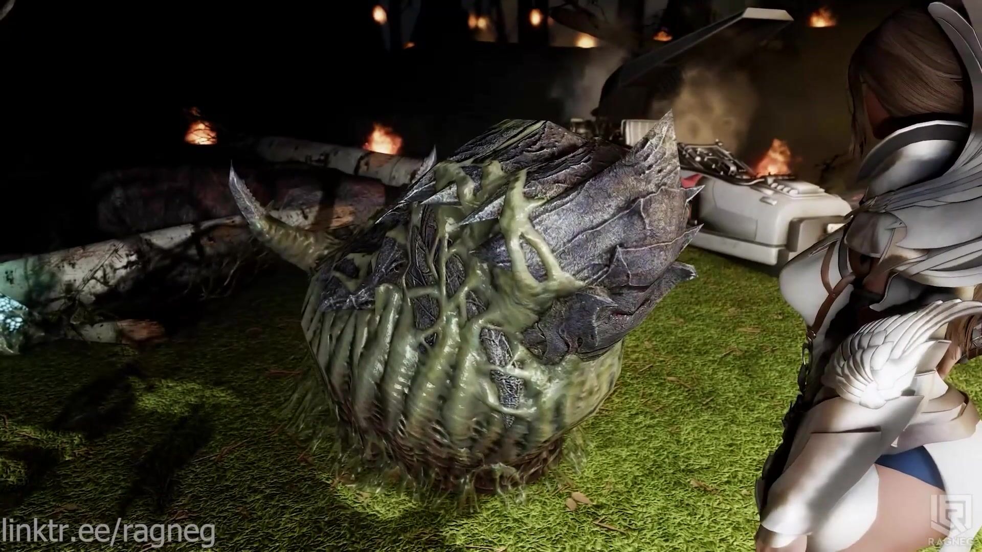 The Chaurus has returned and is holding a knife at an angle that perfectly fits within the ruins of their surroundings. It seems as if they are ready to fight for their survival, but who or what are they up against? This hentai PORN video description suggests a battle scene between two unknown entities, but it's left up to interpretation.