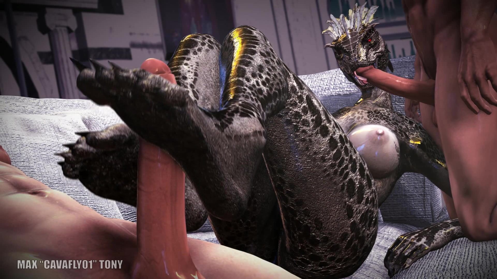 It's been a real intense Friday night at the club down the road. Nurja left the music and alcohol pumping through her veins, mesmerizing people in here with her exotic dances she knew a lot of good moves. The place felt as alive as ever, and that's what she was looking for coming here to explodes all the energy she accumulated over the last weeks. Tonight is her night, and she decided it was a night she would get laid, no matter what, no matter who. Even though she was looking drunk and danced all night long, she was in fact analyzing for a man to have sex with. The night went on, morning was rising slowly, the club was closing, and she still hasn't find anyone. People were living one by one, and soon the club was almost empty. That's when she saw them. Tow human men were fixing here, sitting at the bar, talking to each other. When she came here, she didn't actually thought about getting two men at the same time, but the more she was looking at them, the more she was thinking about it. They finally made their move, approached her with a drink to offer, and started the talk. The club was getting emptier, but was still not closed. They took one of the couch for further drinking. The more they spoke, the hotter it was getting, and they finally started to make out and undressed on the couch. Screw the few people remaining! Nurja wanted it, and she wanted it now! And so did the two guys.