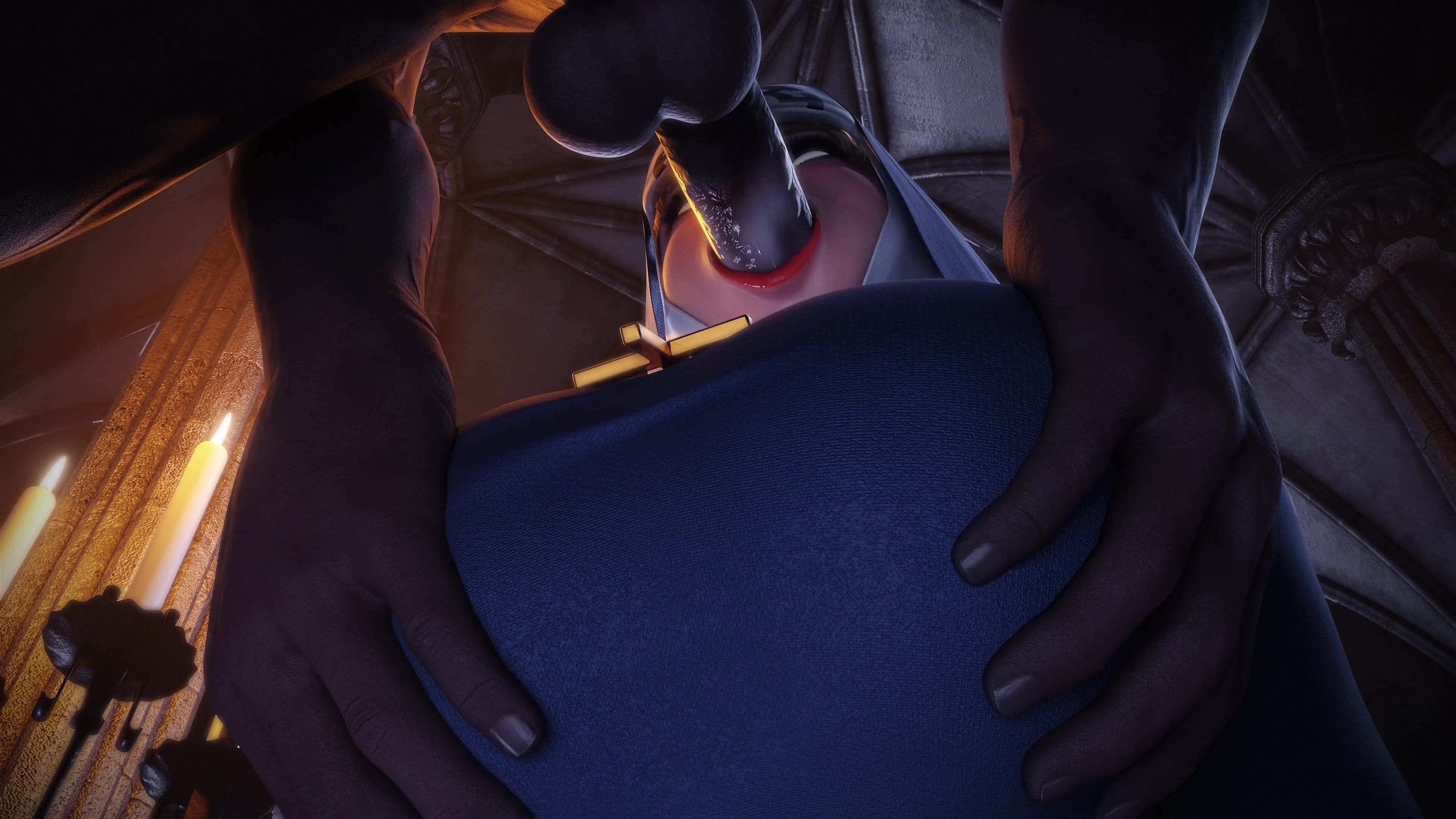 This is a hentai PORN video description of a woman performing double fellatio on two black men while wearing a sexy black dress.