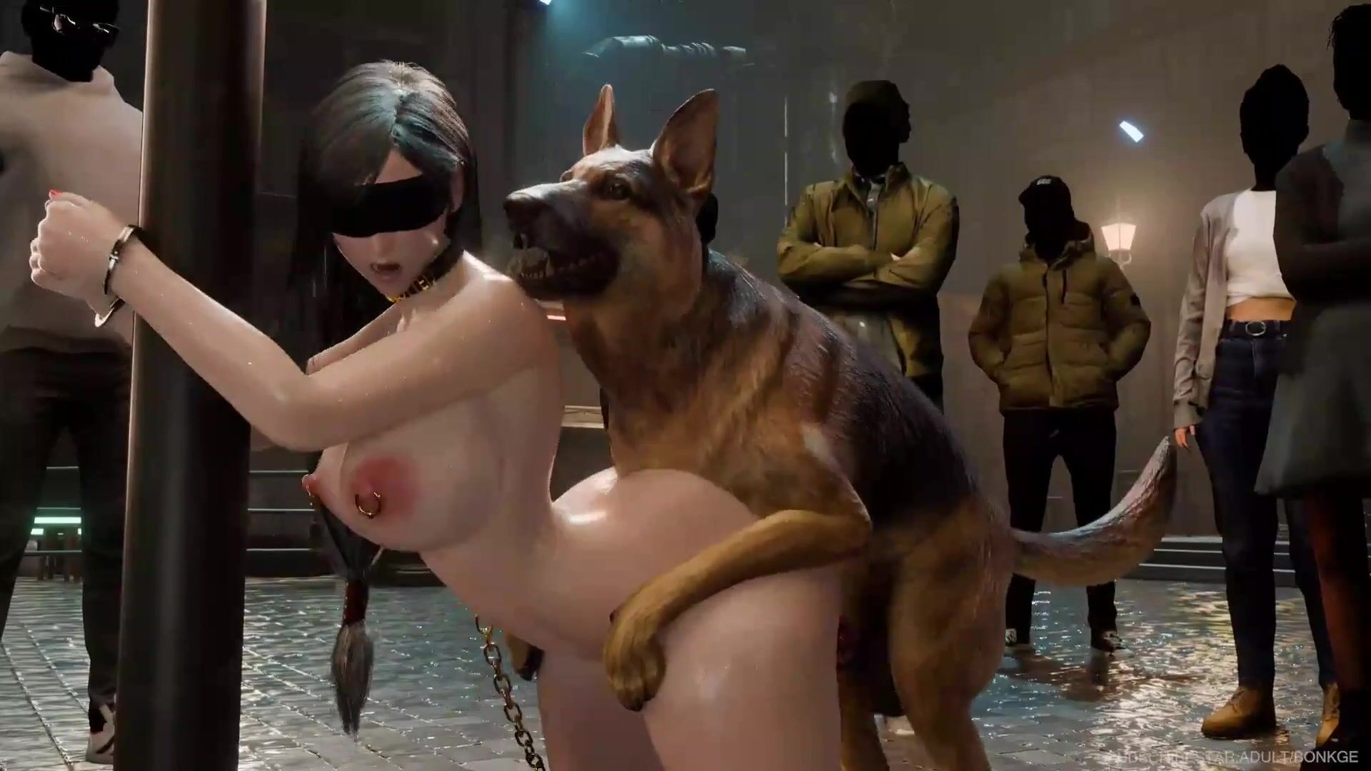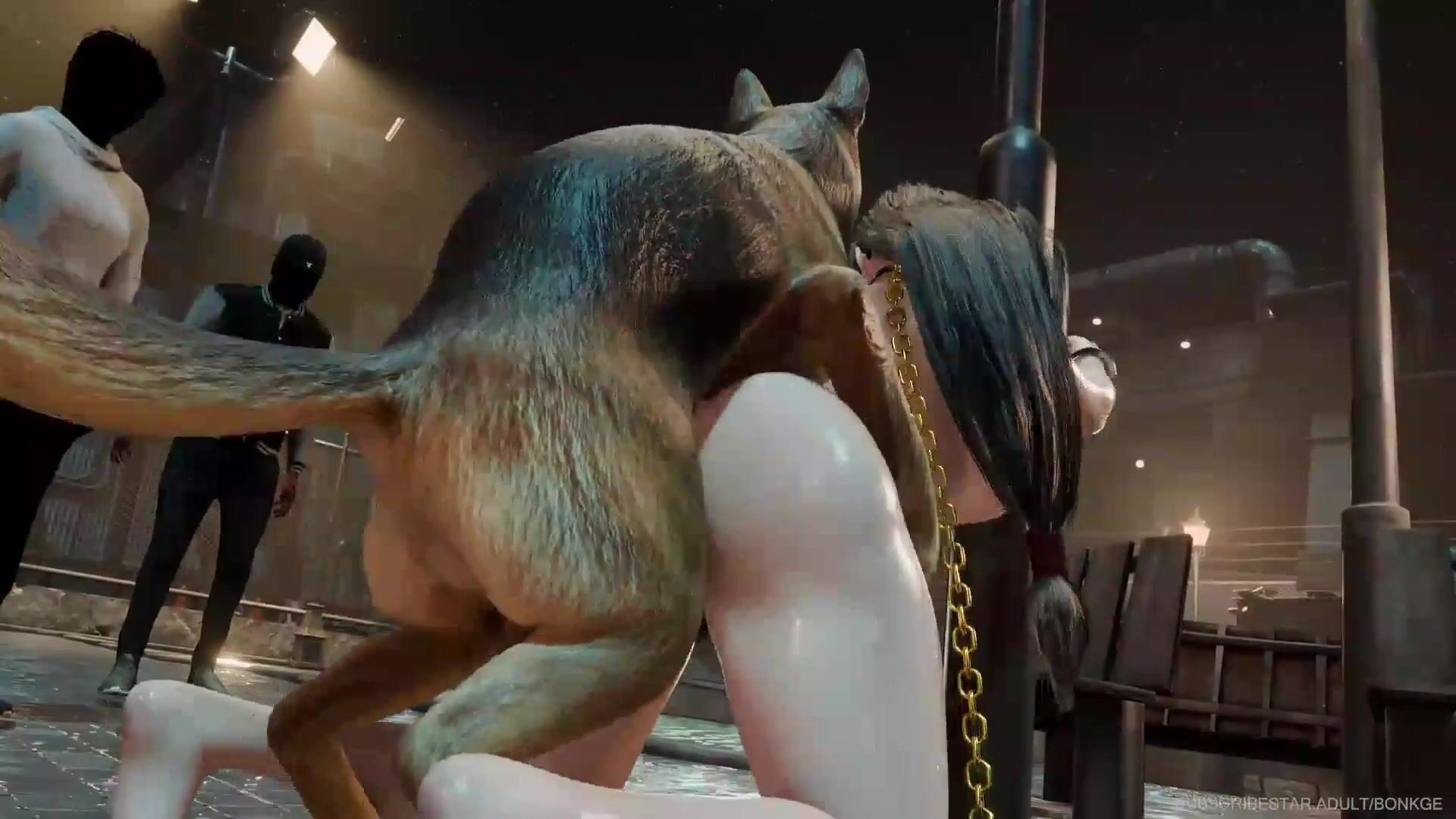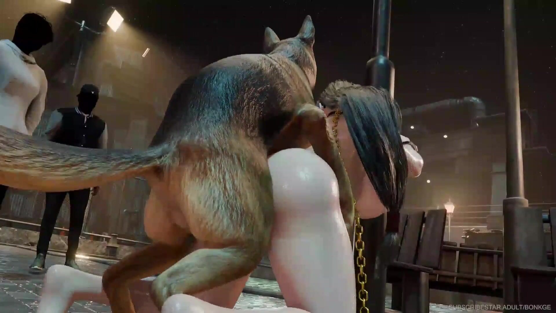 Tifa blindfolded, wearing a collar, attached to a chain and giving in to her more beastly BDSM desires.