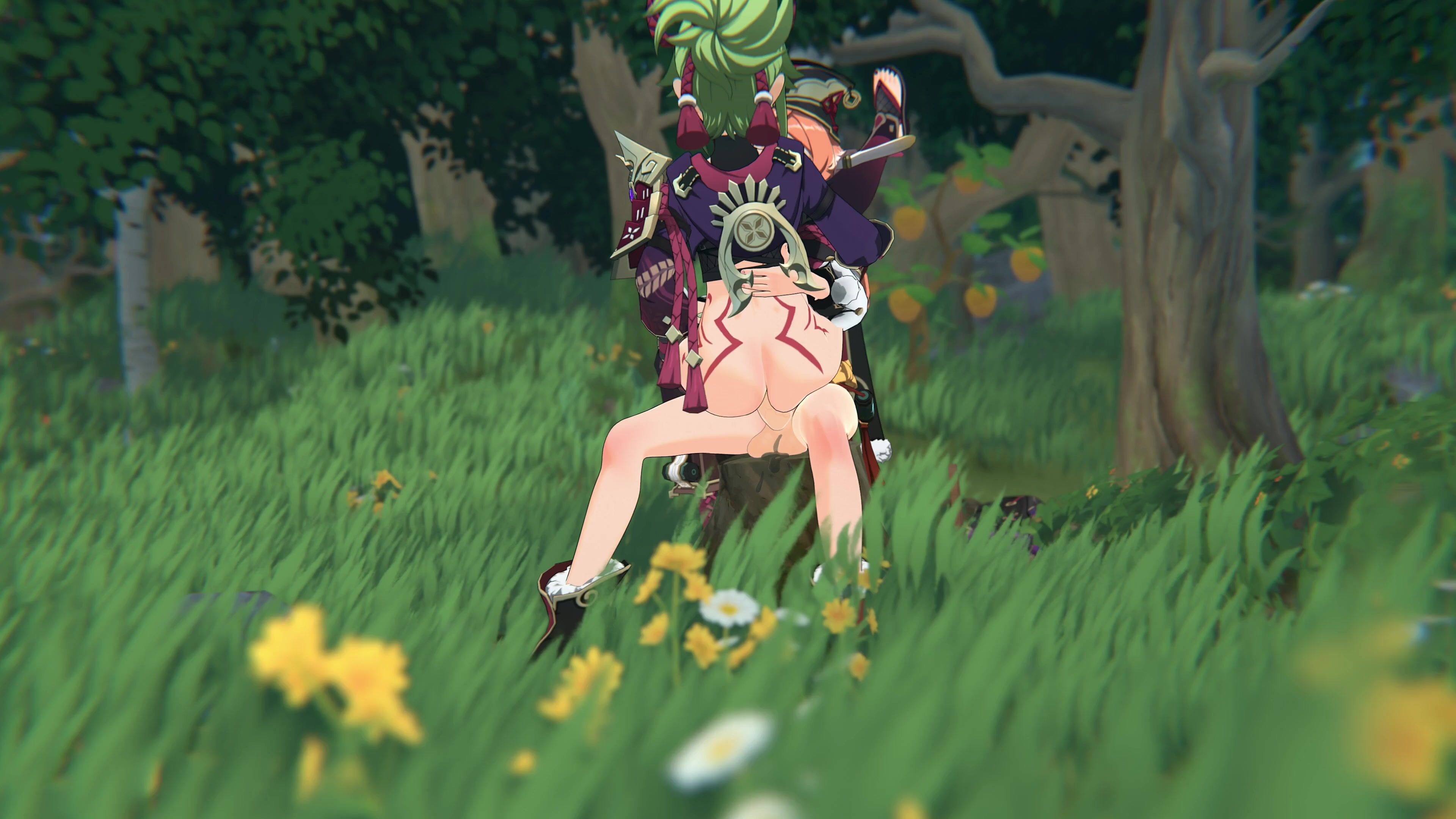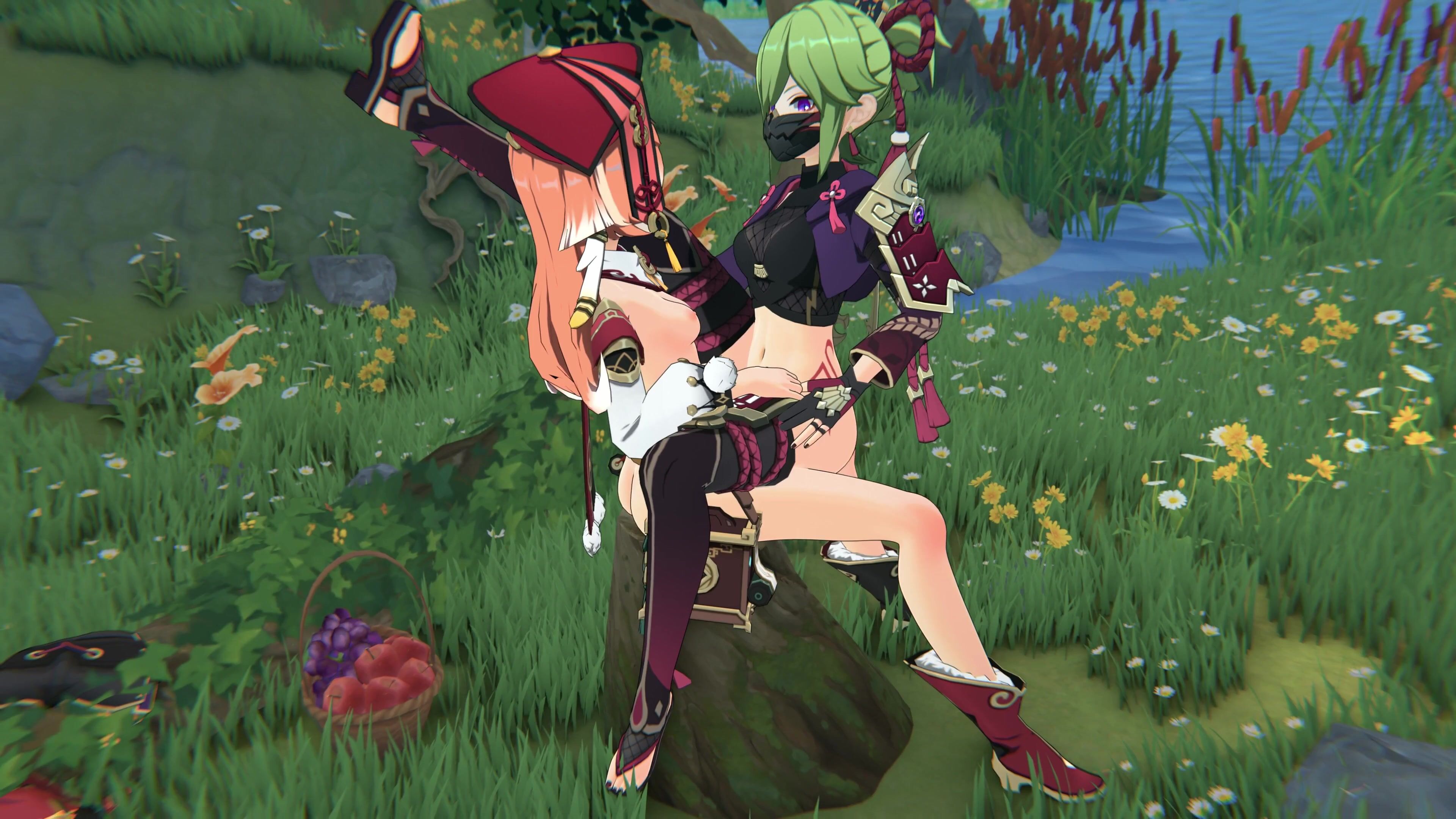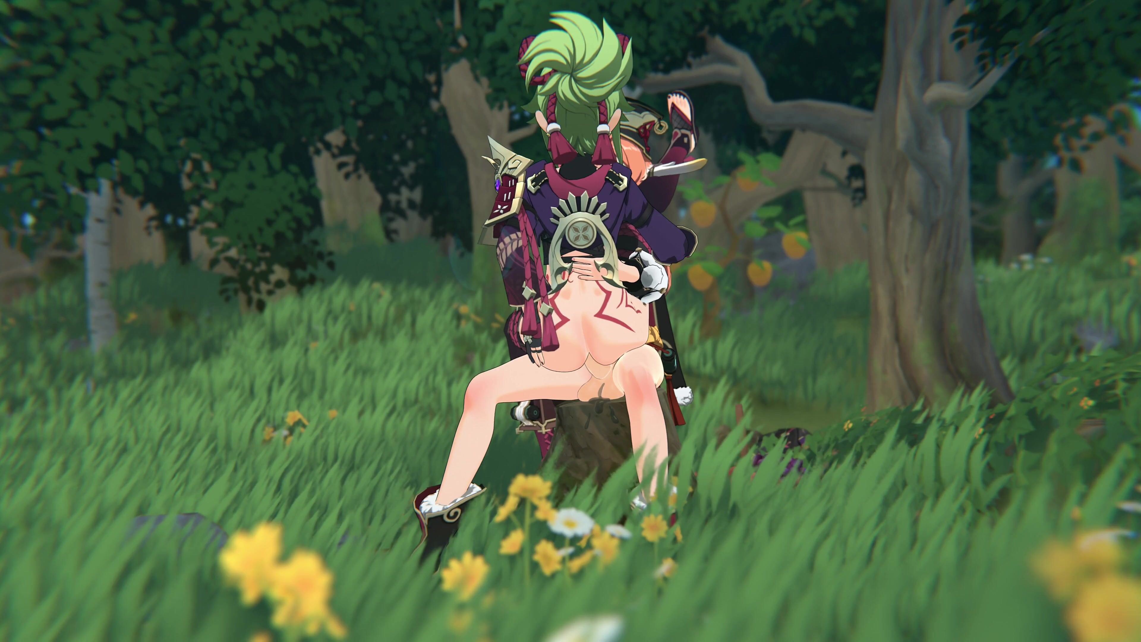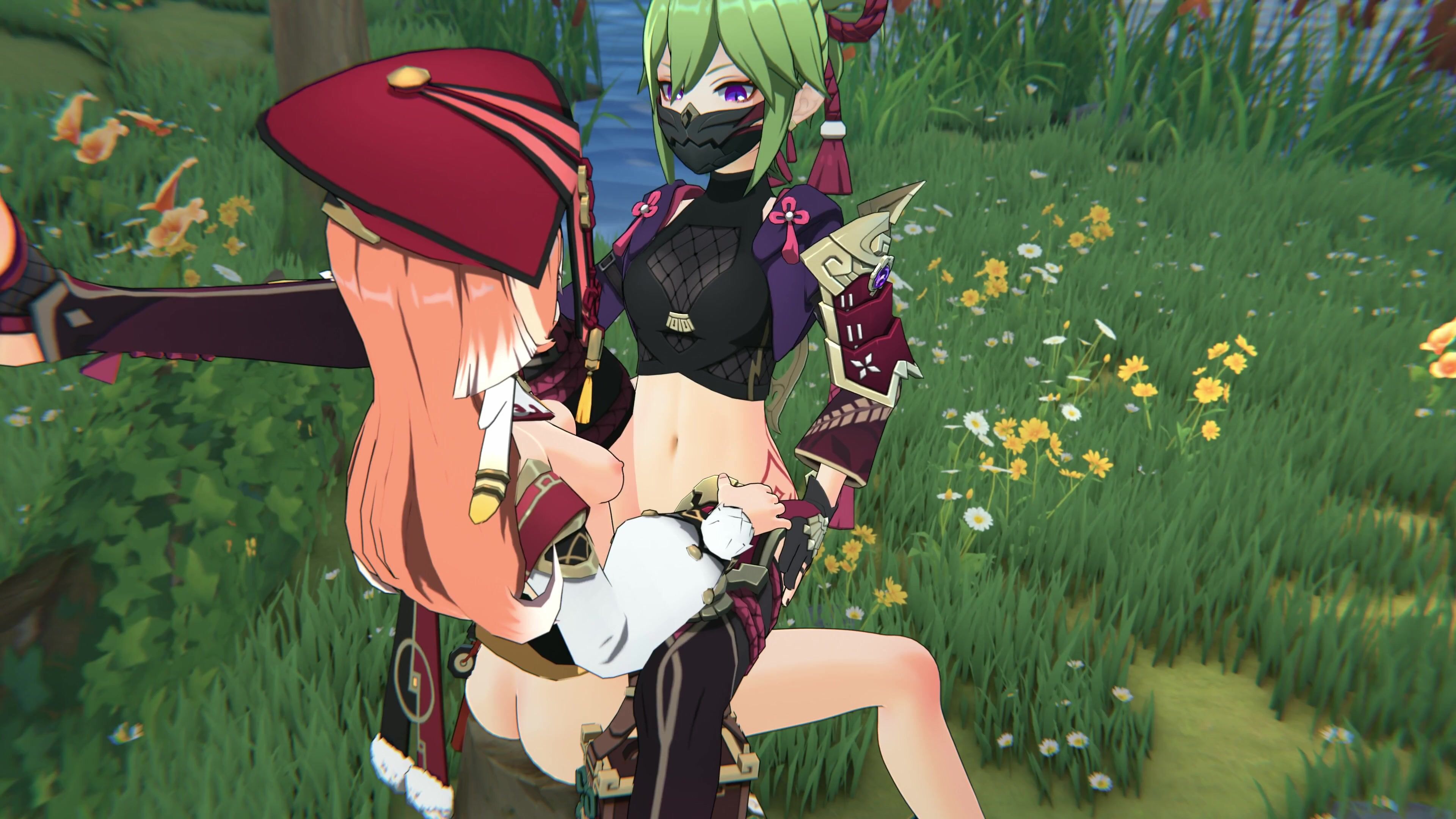 Kuki & Shinobu have sex with x while Yanfei watches and strokes his own cock in the background