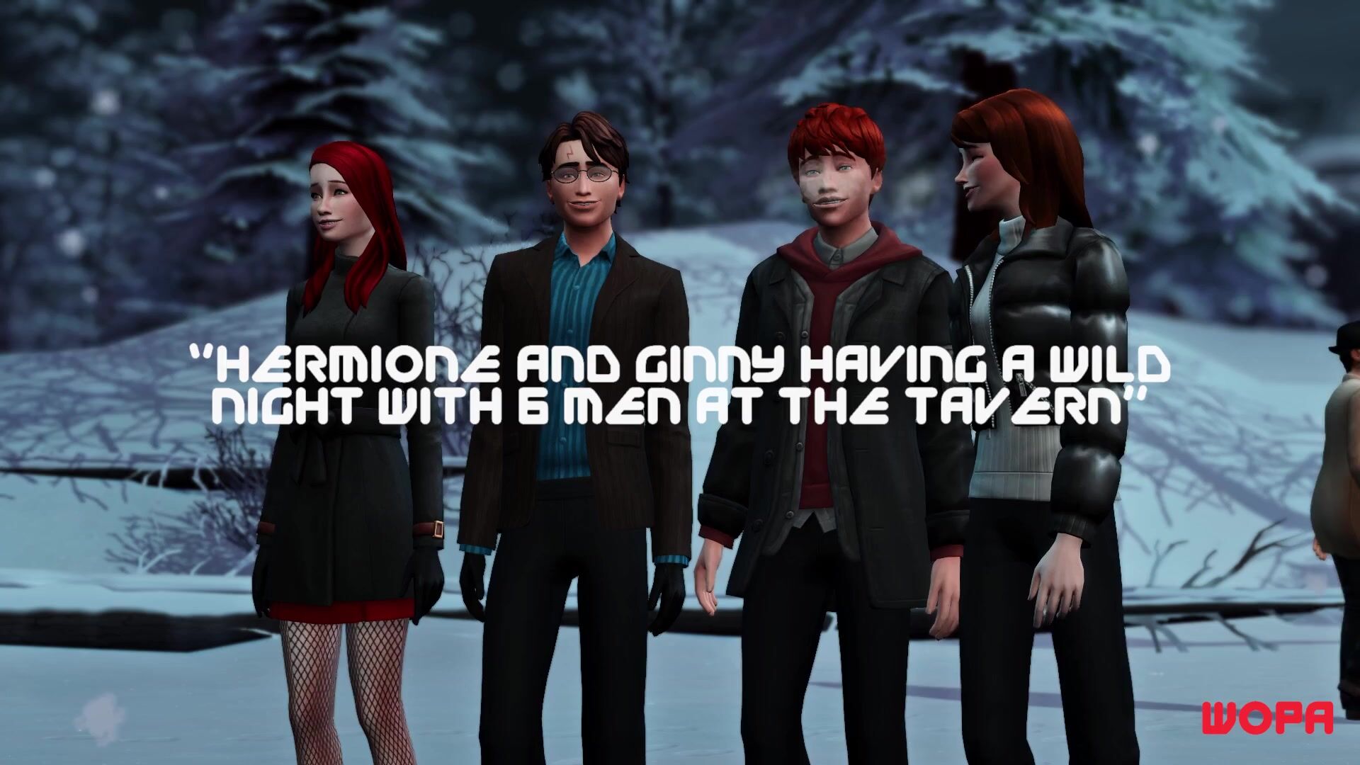 This hentai PORN video description rephrased, Draco Malfoy and his friends are fucking Ginny Weasley while Hermione is waiting with horns.