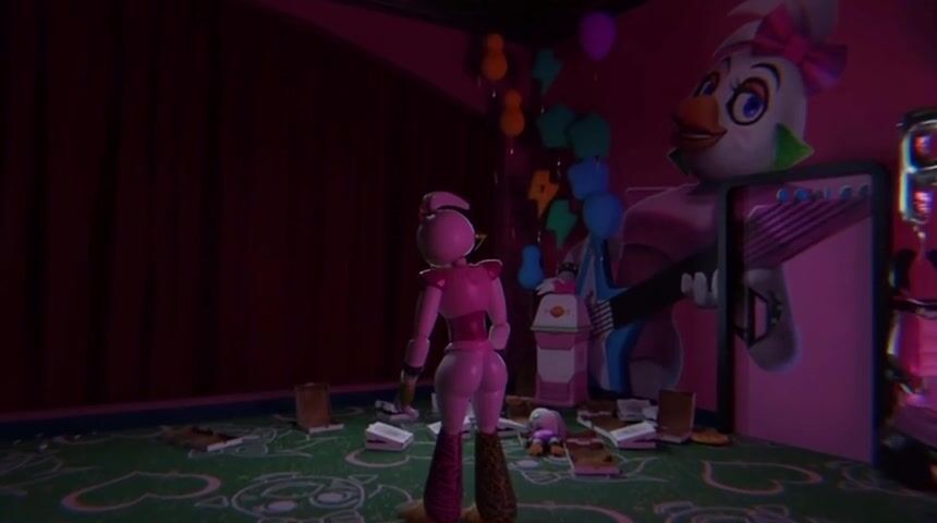 A man stumbles across a powered off glamrock Chica backstage. Upon touching her she awakes but that doesn’t stop him from having his way with the robot. It seems she’s into it as they transverse two other positions before finally finishing on her face.