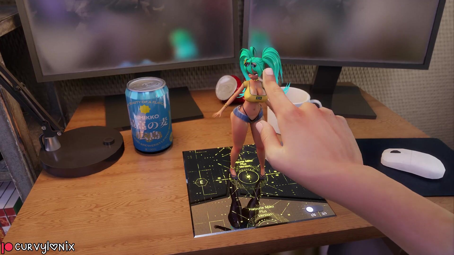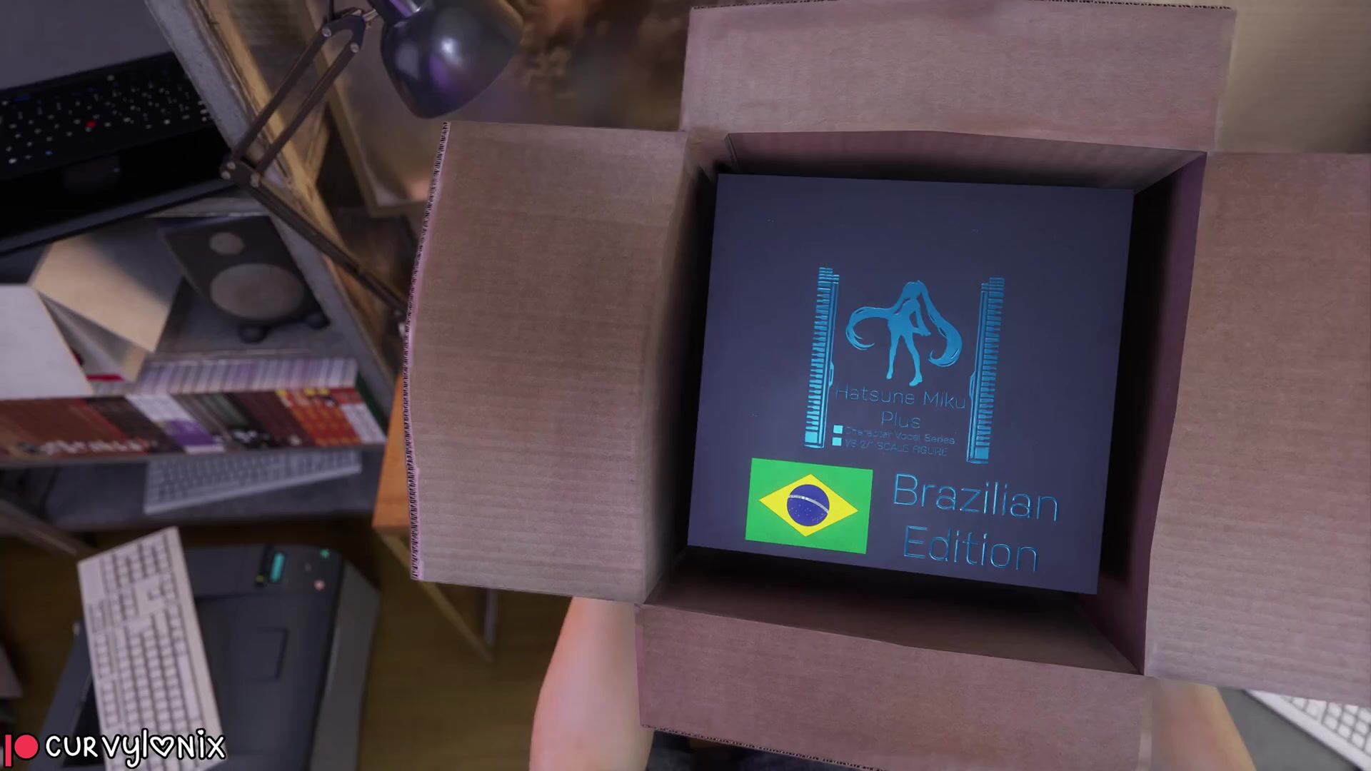 Miku Hatsune Unboxes a Brazilian Figure in Curvy Positions, Surrounded by Gorgeous Men