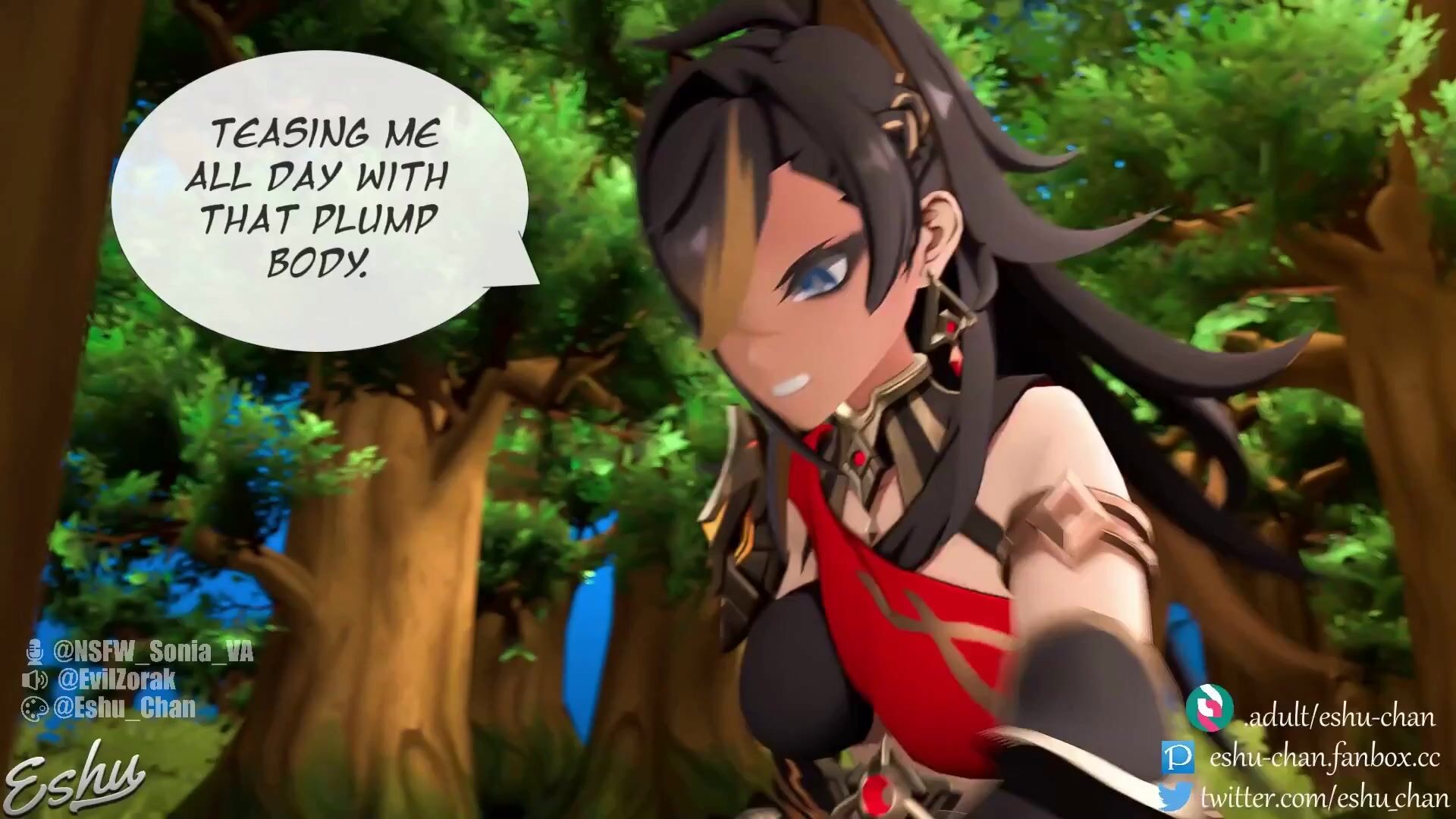 This hentai PORN video description has been rephrased for clarity. Animator 3A and Eshu-Chan VA teamed up with Dehya, Elin, and Sonia VAs to create an explicit SFX pack. They edited the video to stretch certain parts of it to match the dialogue as much as possible. In the original video, there was not much room for dialogue to be spoken, so when the VAs recorded their lines, they didn't put in moans in between due to time constraints. Therefore, a separate recording was made with moans in the background while the VAs spoke their lines. This way, both dialogue and moans can be heard clearly throughout the video.