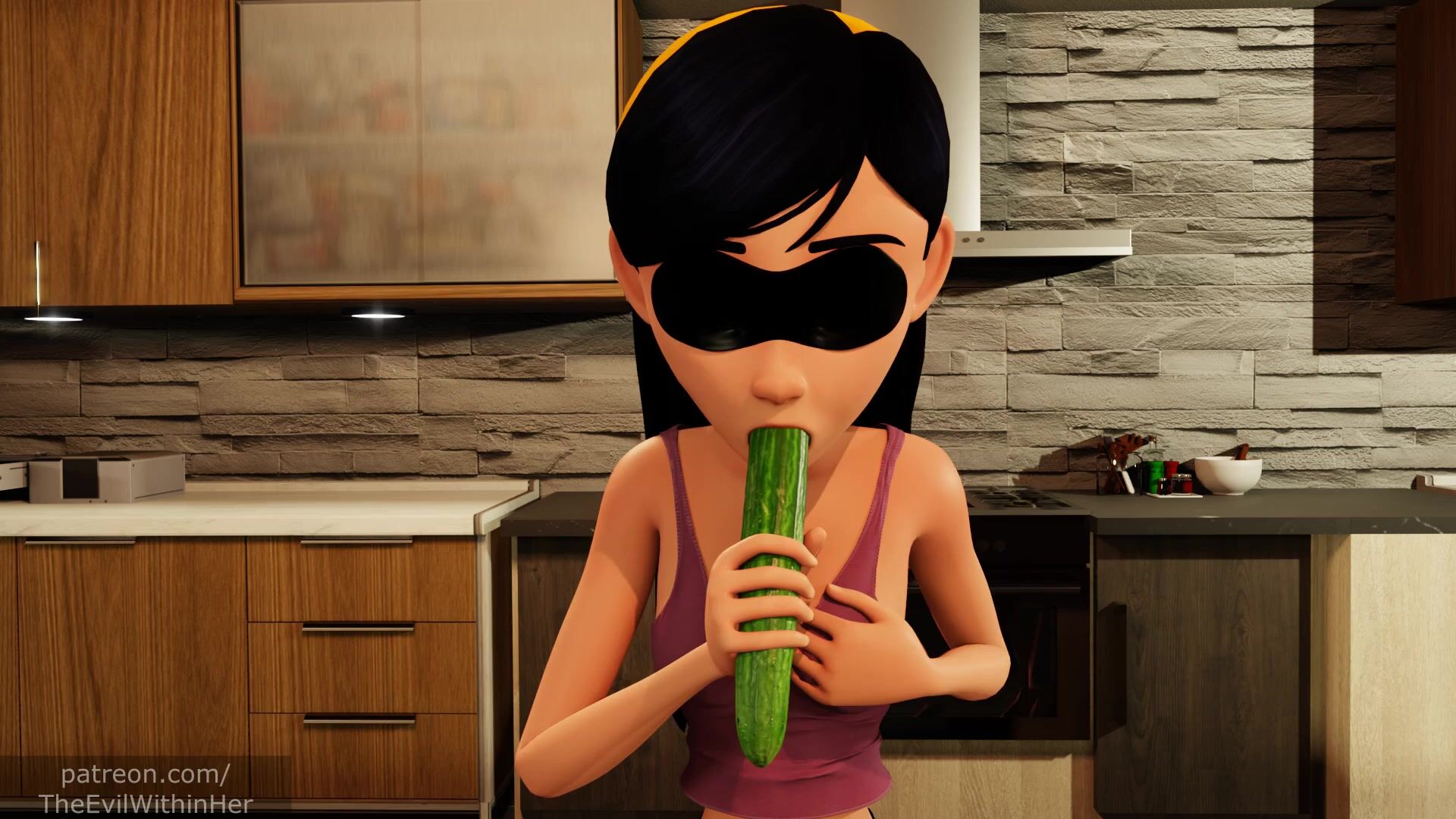 "Porn-star, Vi, takes her cucumber and starts to play..."