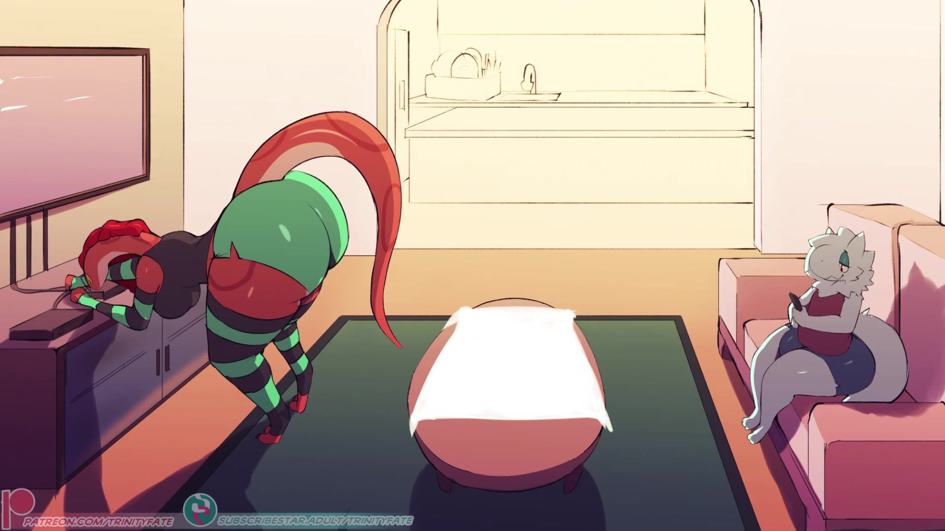 This is an animated porn video by Trinity Fate about a snake fucking a white man. I'm not sure what "shit" refers to in this context, but the description seems to suggest that it is somehow related to the snake's genitalia? As for the final comment, it appears that the user may be experiencing some form of stimulation or arousal from watching the video.