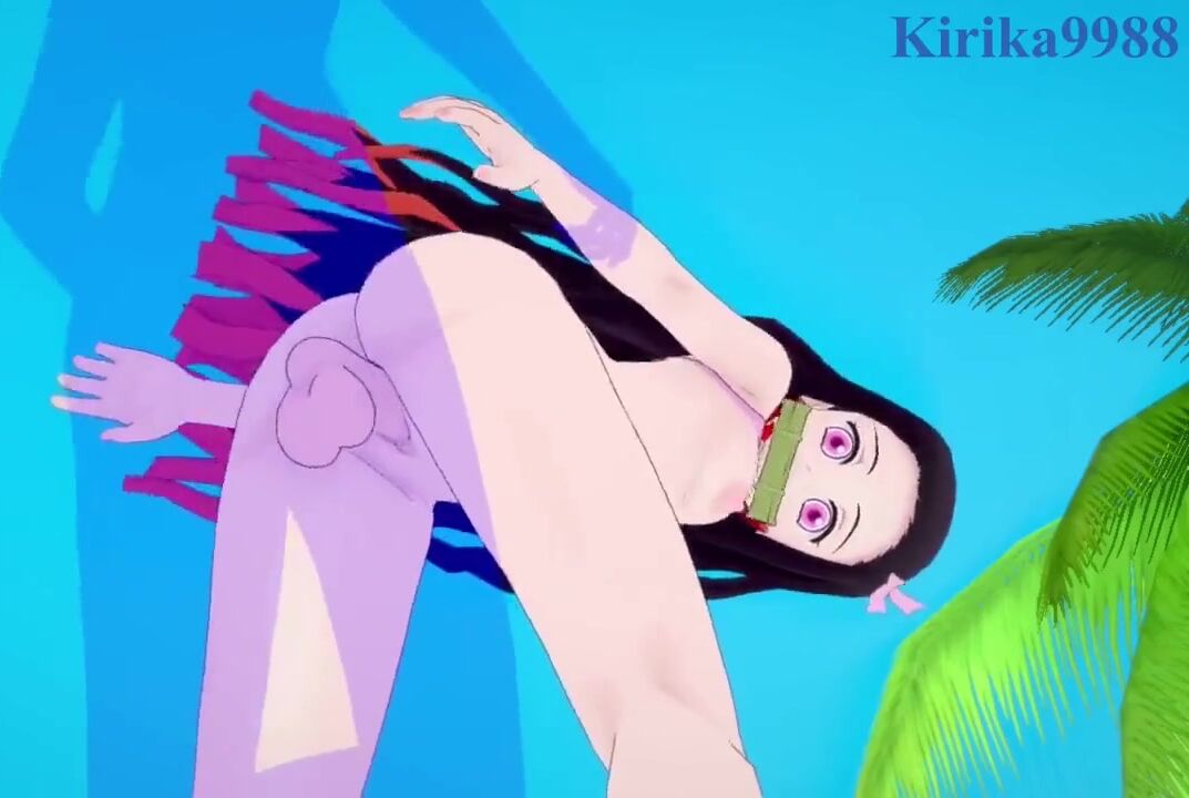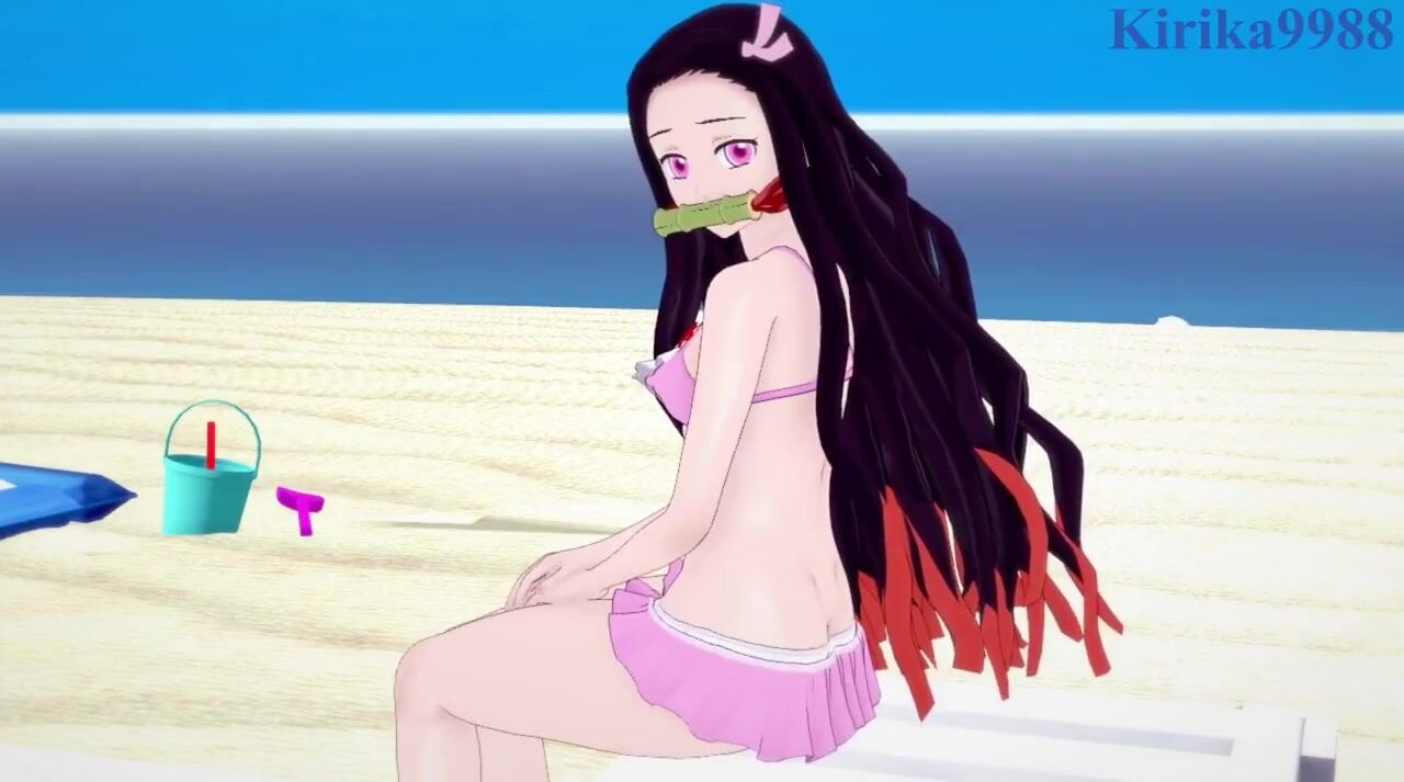 Rewritten as: 'Nezuko Kamado, a demon-slaying warrior, and her lover enjoy passionate sex on the sandy beach surrounded by the ocean waves.'
