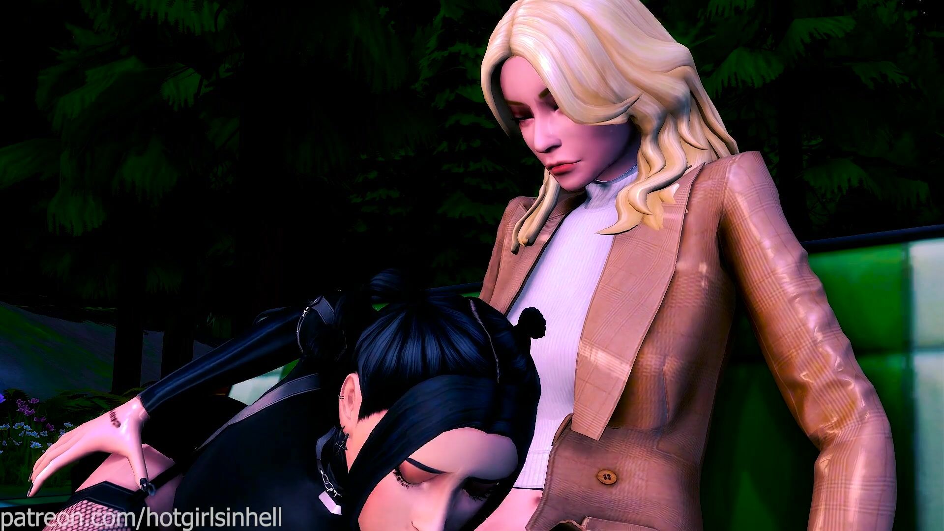 A goth girl and a dark academia girl have a passionate time in the middle of a forest.