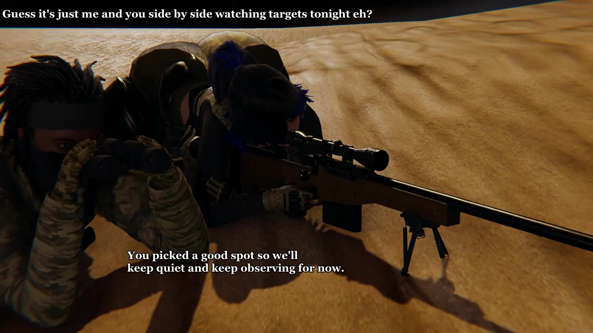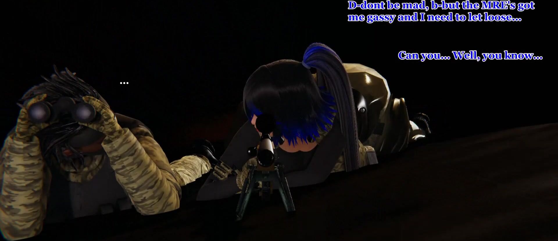 During observations, Amaya's stomach starts getting uneasy... Can Kaine help keep the noise suppressed so they don't get spotted by the target? Please enjoy the preview! Full animation should be ready for Friday!