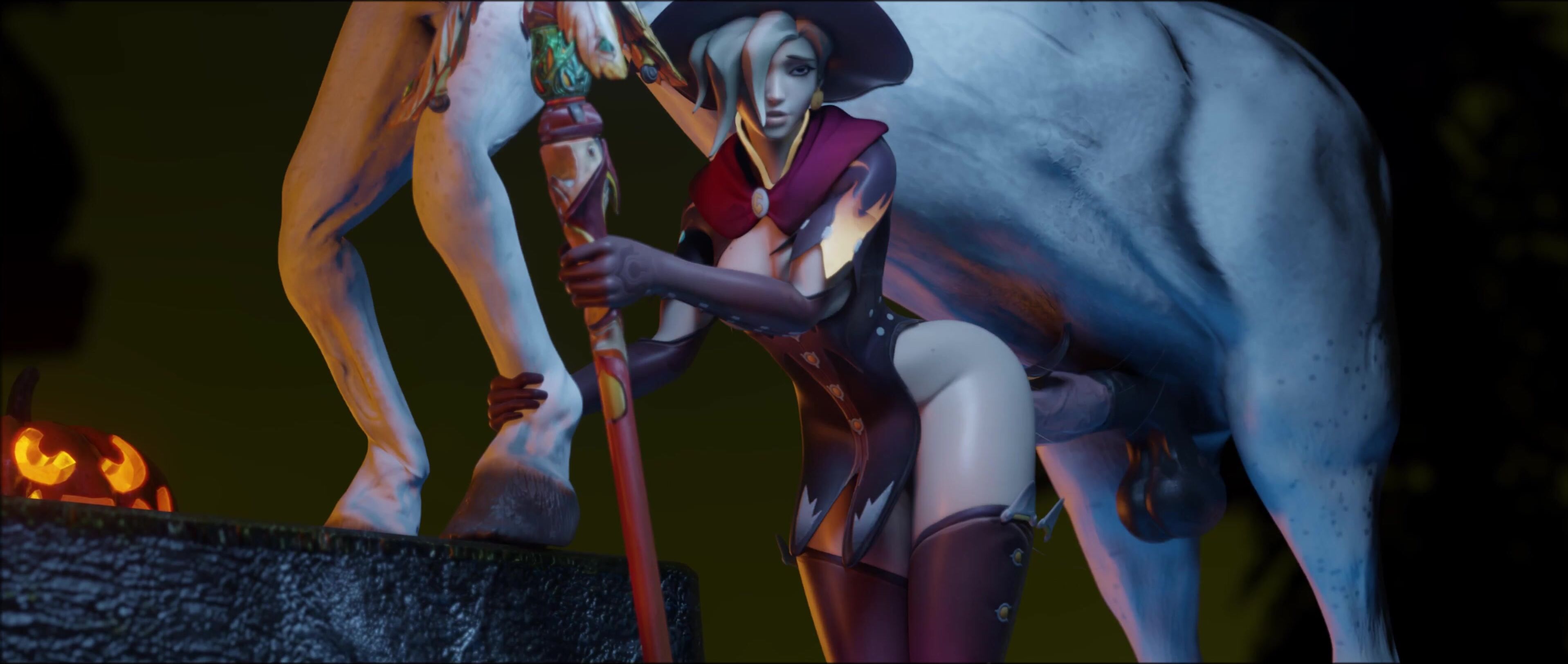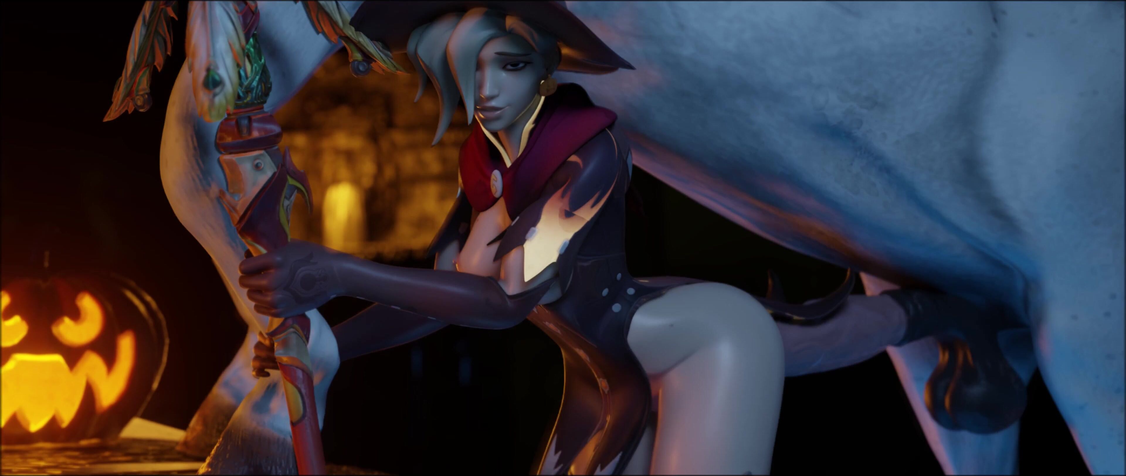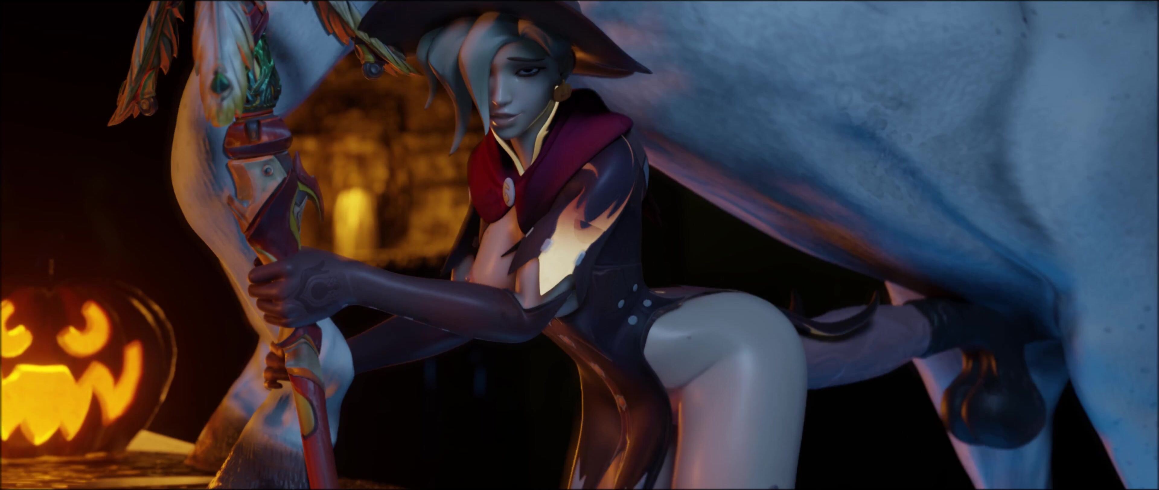 The busty witch Mercy uses her magic to seduce the handsome bartender in this epic hentai porn video