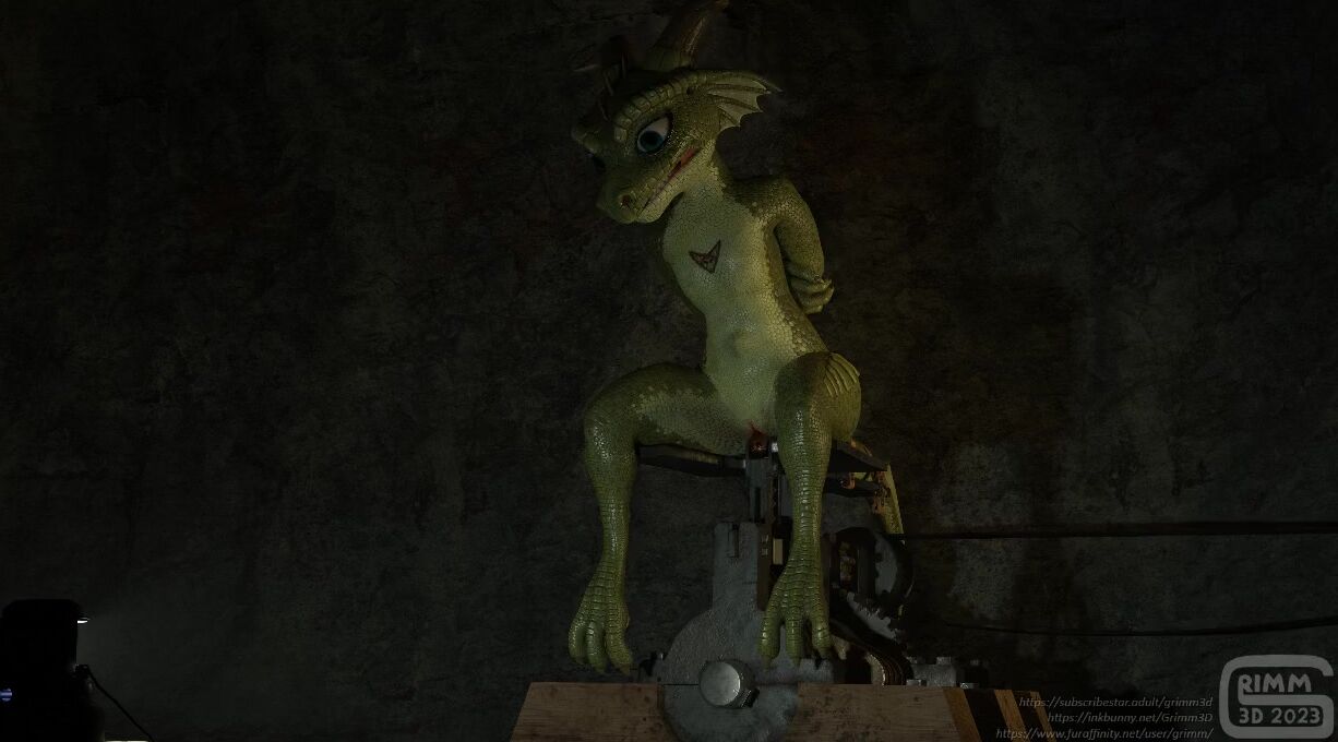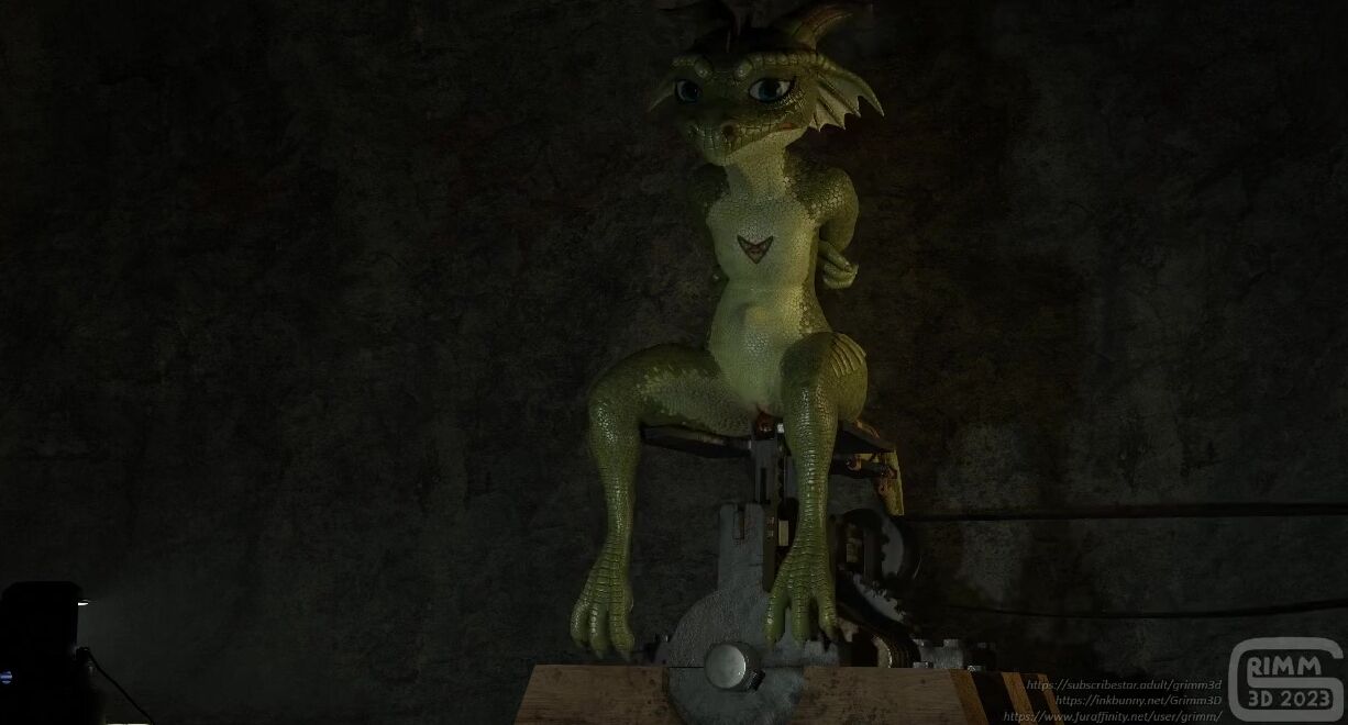 This porn video description rephrases the original text into a more formal and polite language. The machine in this hentai PORN video is described as evil, and it seems that the female drazil has been captured by the hermit who plans to keep her for a while. The machine is powered by a waterwheel from a nearby waterfall or river, which endlessly shags the victim strapped to it by their tail. There is also a long and large butt plug that keeps the victim from escaping, and any attempt to squirm off the seat would very likely destroy the victim's insides as they can't reach the ground to lift their body. The machine can be used to prepare small tight holes for zapper dicks or in general be used to open up the victim's cervix. The plugs and dildos are changeable, but it seems that such a mechanism wouldn't work that well. Higher resolution versions of this hentai PORN video are available on Subscribestar for all subscriber tiers.