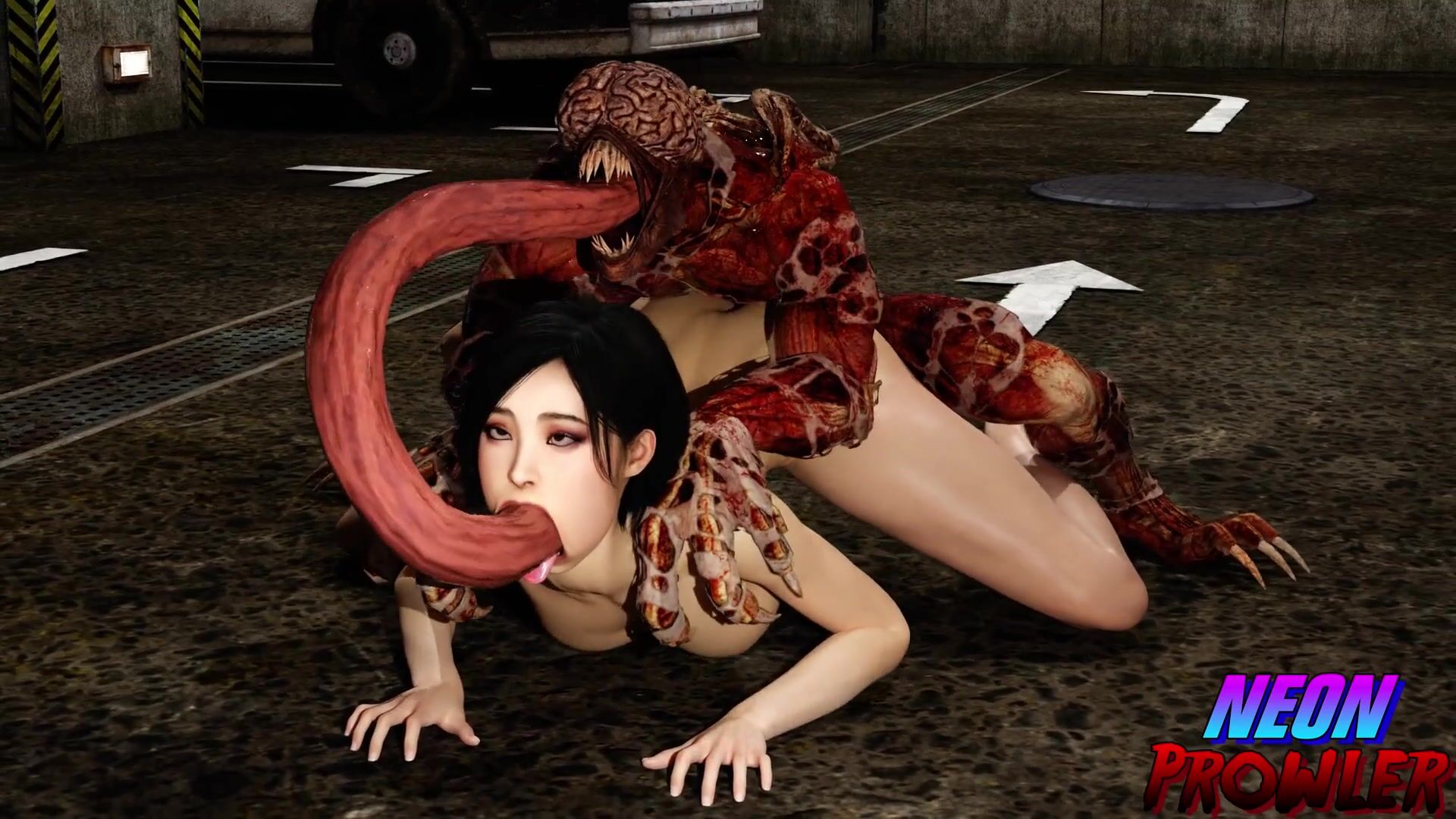 The Licker, a mutated creature from the Resident Evil franchise, penetrates Ada Wong with his long tongue as she moans in pleasure.