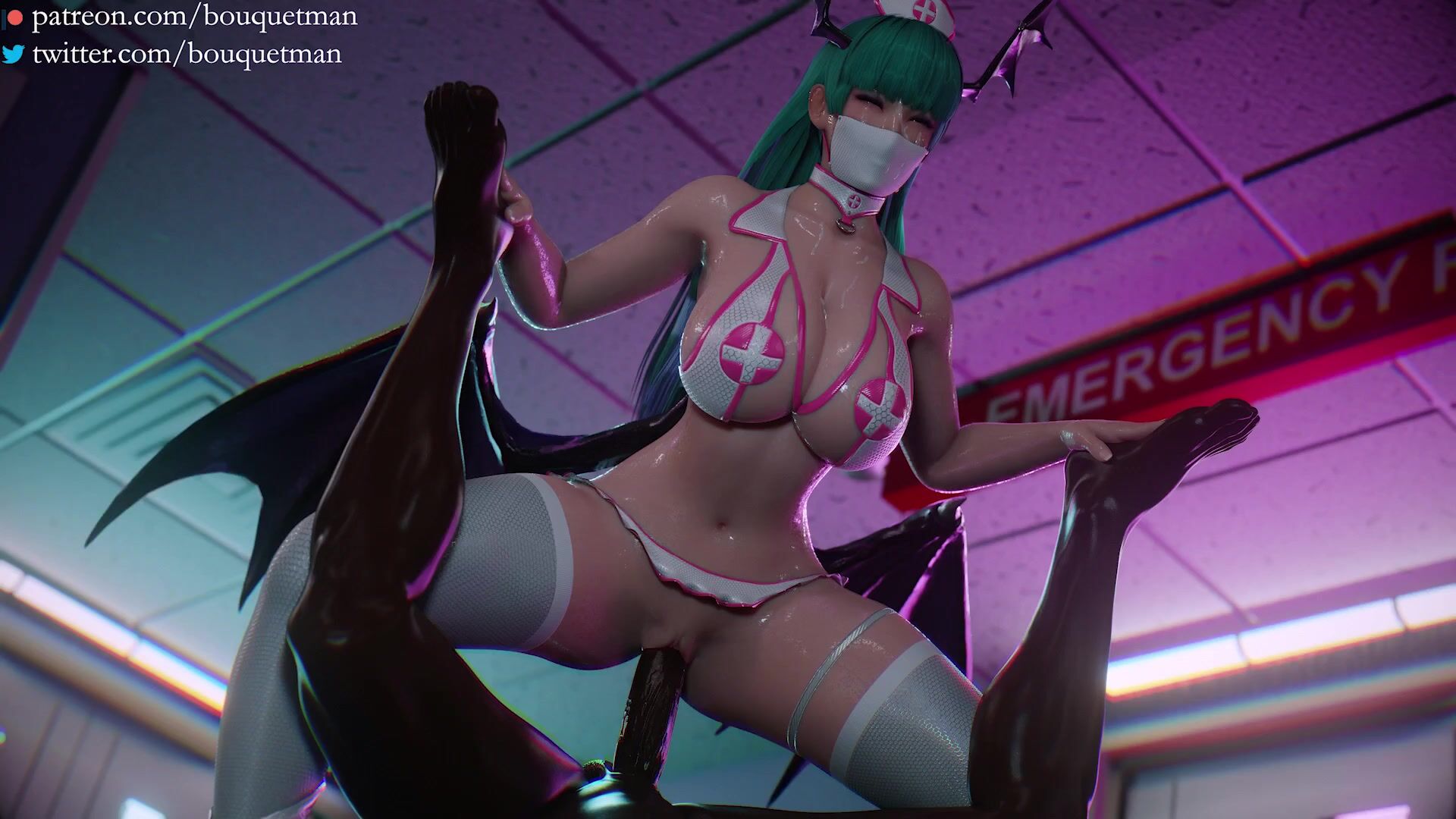 This hentai PORN video description rephrased as follows: A man with erectile dysfunction came to the emergency room for treatment, but his condition was unexpectedly cured by the ER nurse who happened to be a succubus. Since she was running late for her lunch, she decided to take advantage of the situation and satisfy her insatiable hunger for dark meat by having a quick delight with the patient. It seems like this patient is in for a long night as he gets ravaged by the seductive nurse.