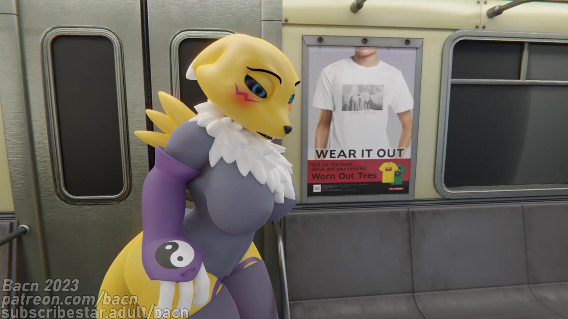 This hentai PORN video description rephrased by an AI artist mentions that the director never worries about whether Renamon is in a good place when he uses her for his videos, and suggests becoming a supporter on Patreon or SubscribeStar to see new videos early and access the models used.