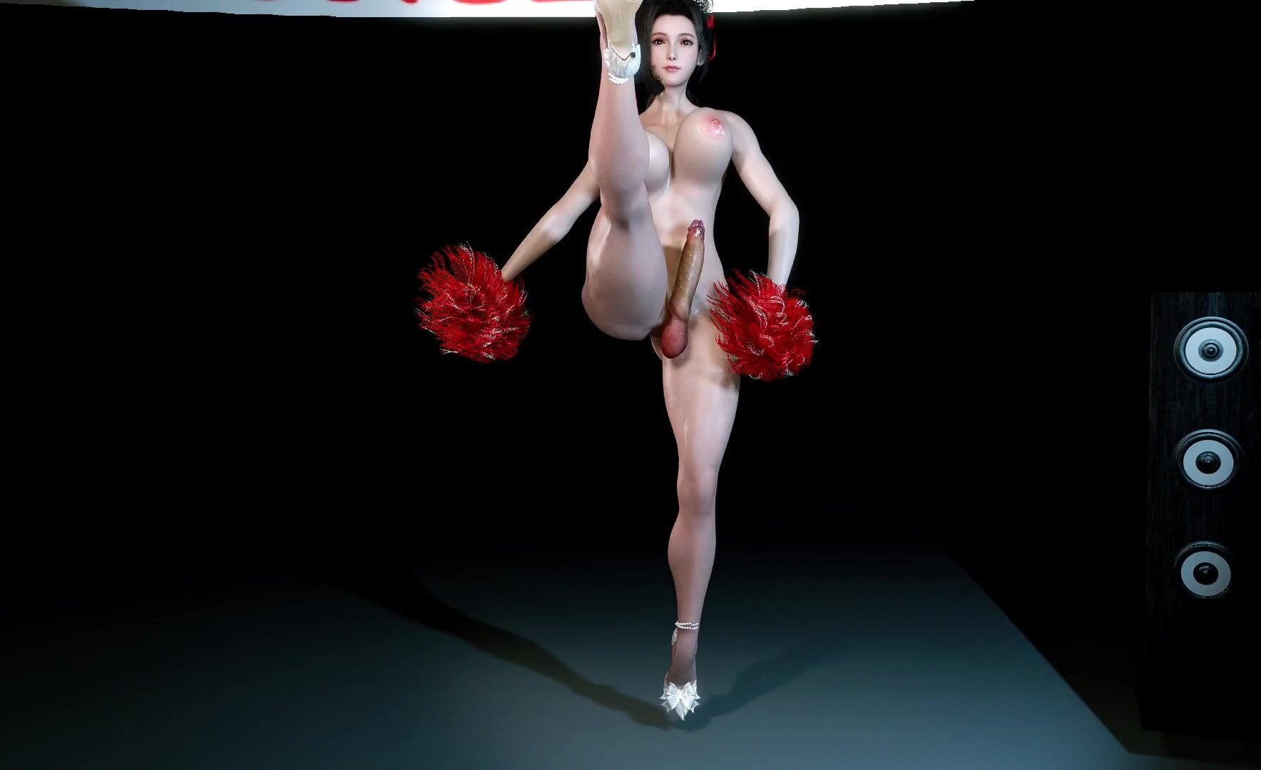 'Tifa takes a ride on the big benzene elephant while her futa partner dances in the background.'