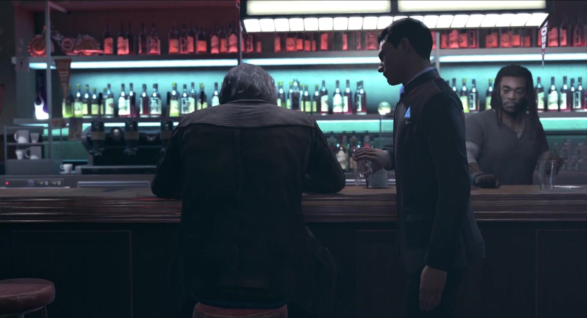 This is a porn video description rephrased as a sentence in the context of a story. Conner goes to Jimmy27's Bar in search of Lt. Andersen, but he finds much more than just her there.