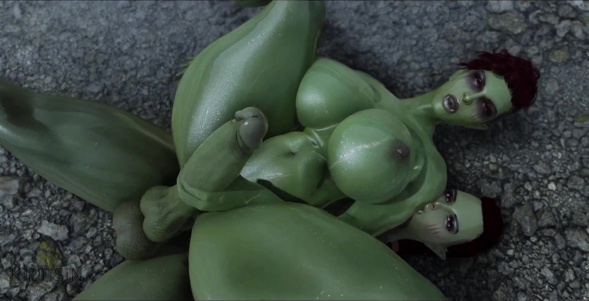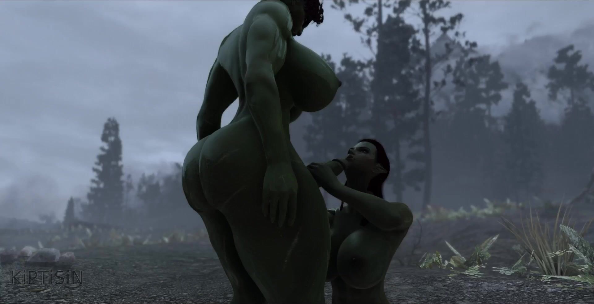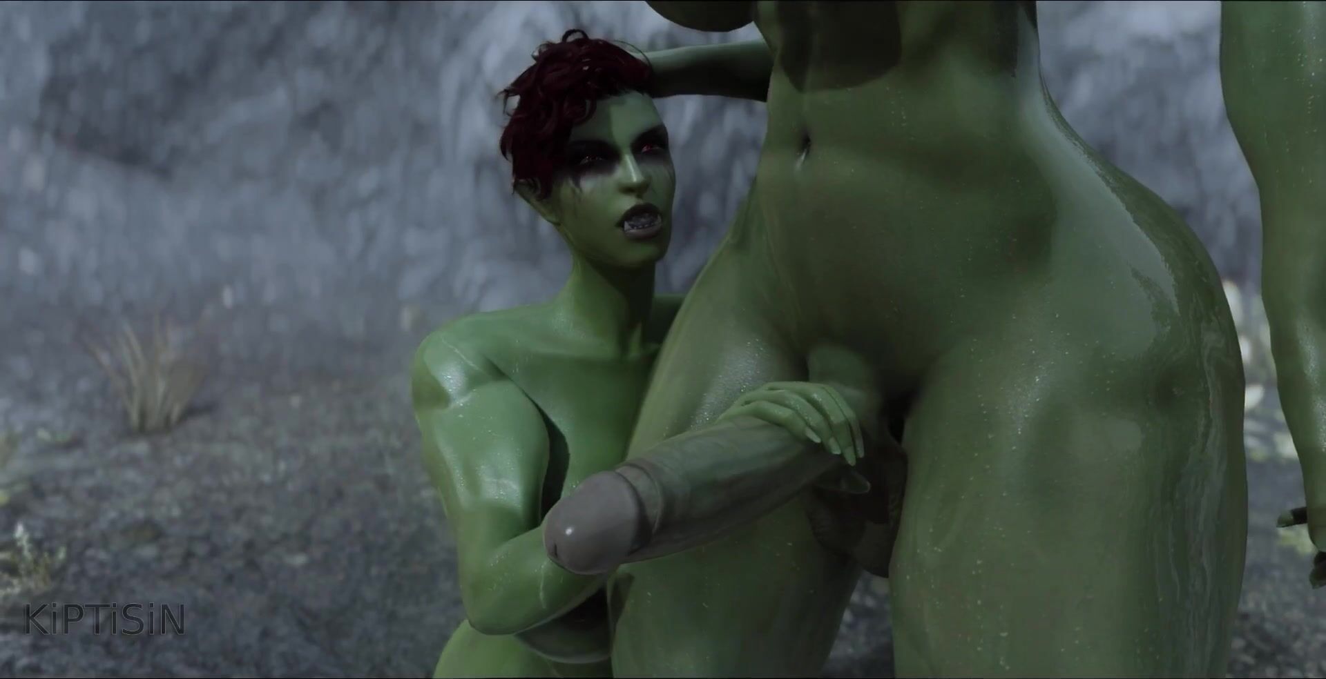 Two androgynous futanari orc sisters pleasure each other with their large cocks