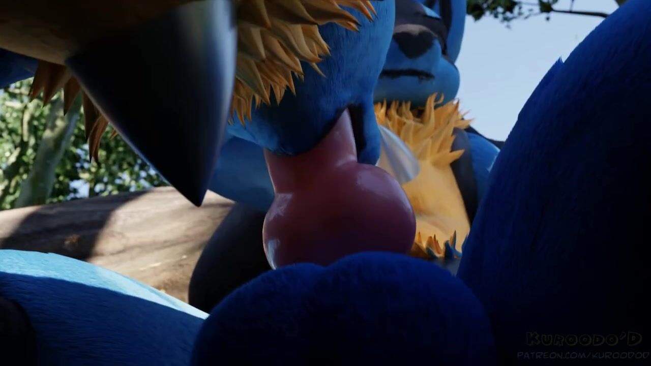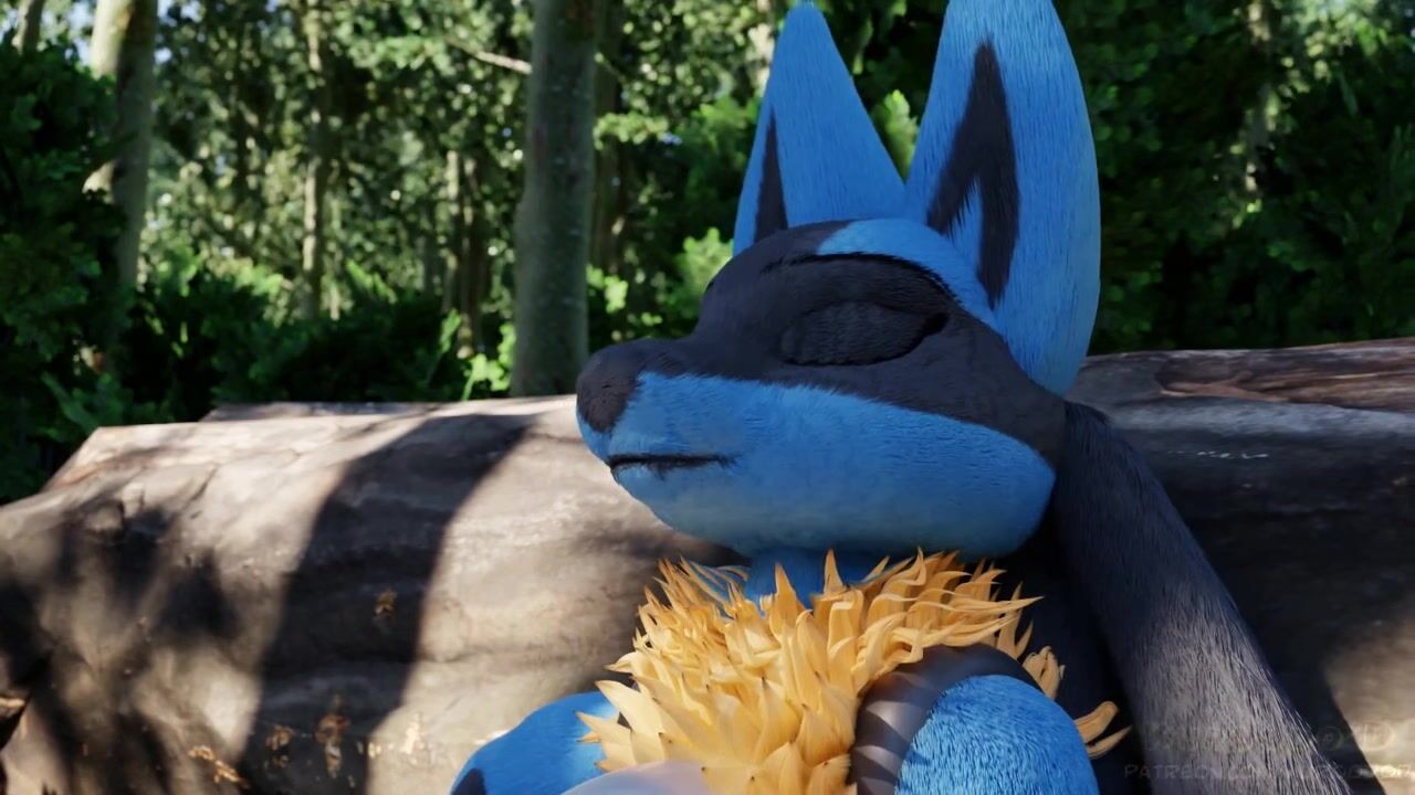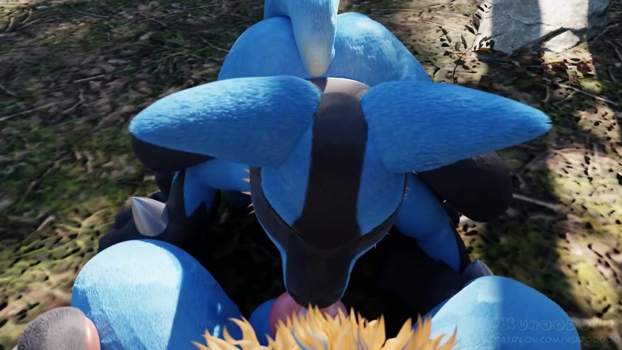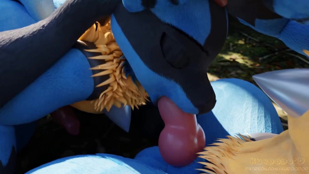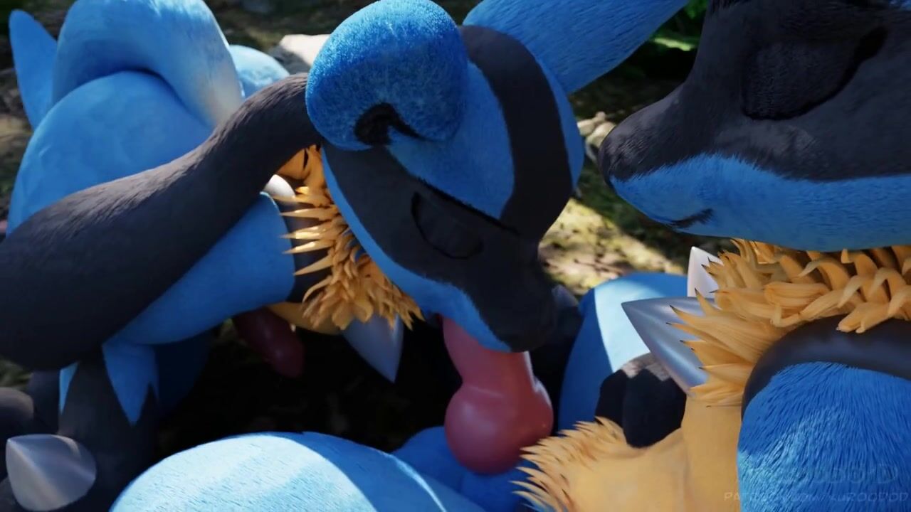 Two female Lucarios find pleasure in sucking on each others tongues while surrounded by the beauty of nature