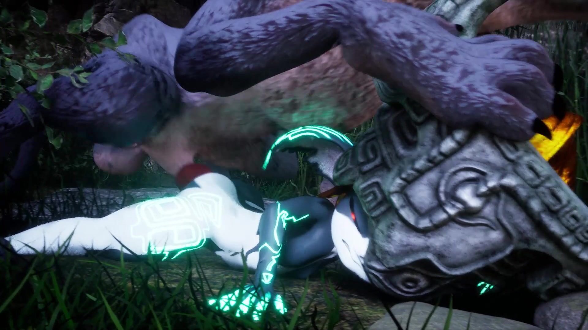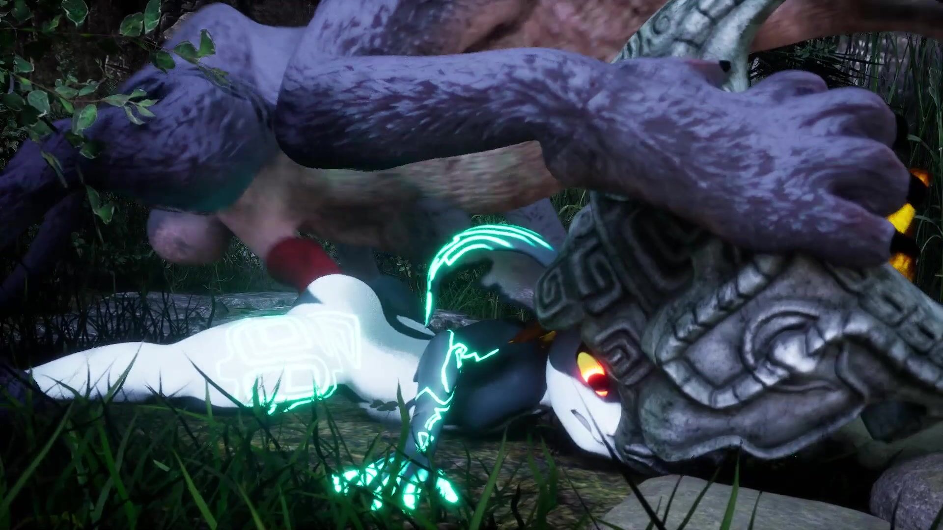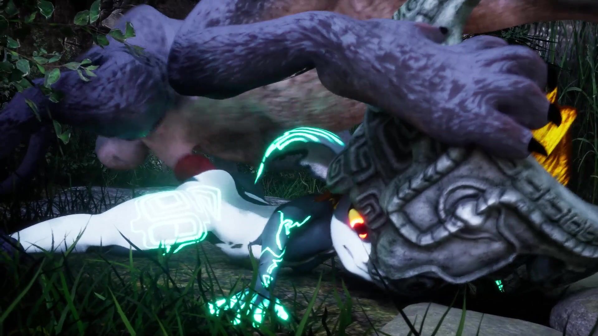 Midna, a character from the Legend of Zelda series, is being violated by a massive creature with a gaping maw. The monster's tongue slides in and out of her tight pussy as it fucks her from behind. Midna's body quivers and jerks with each thrust, her moist cavity stretched wide open for the monster to enjoy. This is a hentai PORN video description.