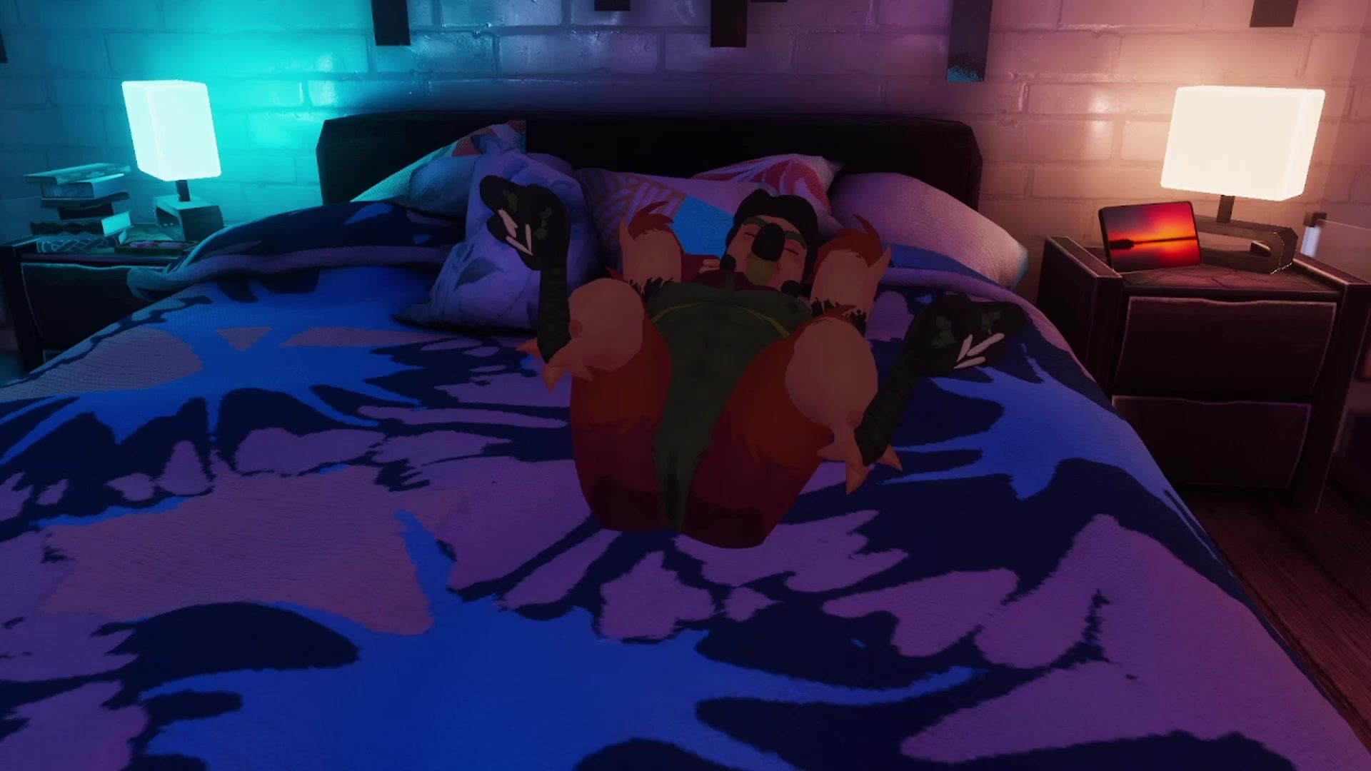 Ralph does some leg stretches while reclining on his bed Avatar and RP by Pythania